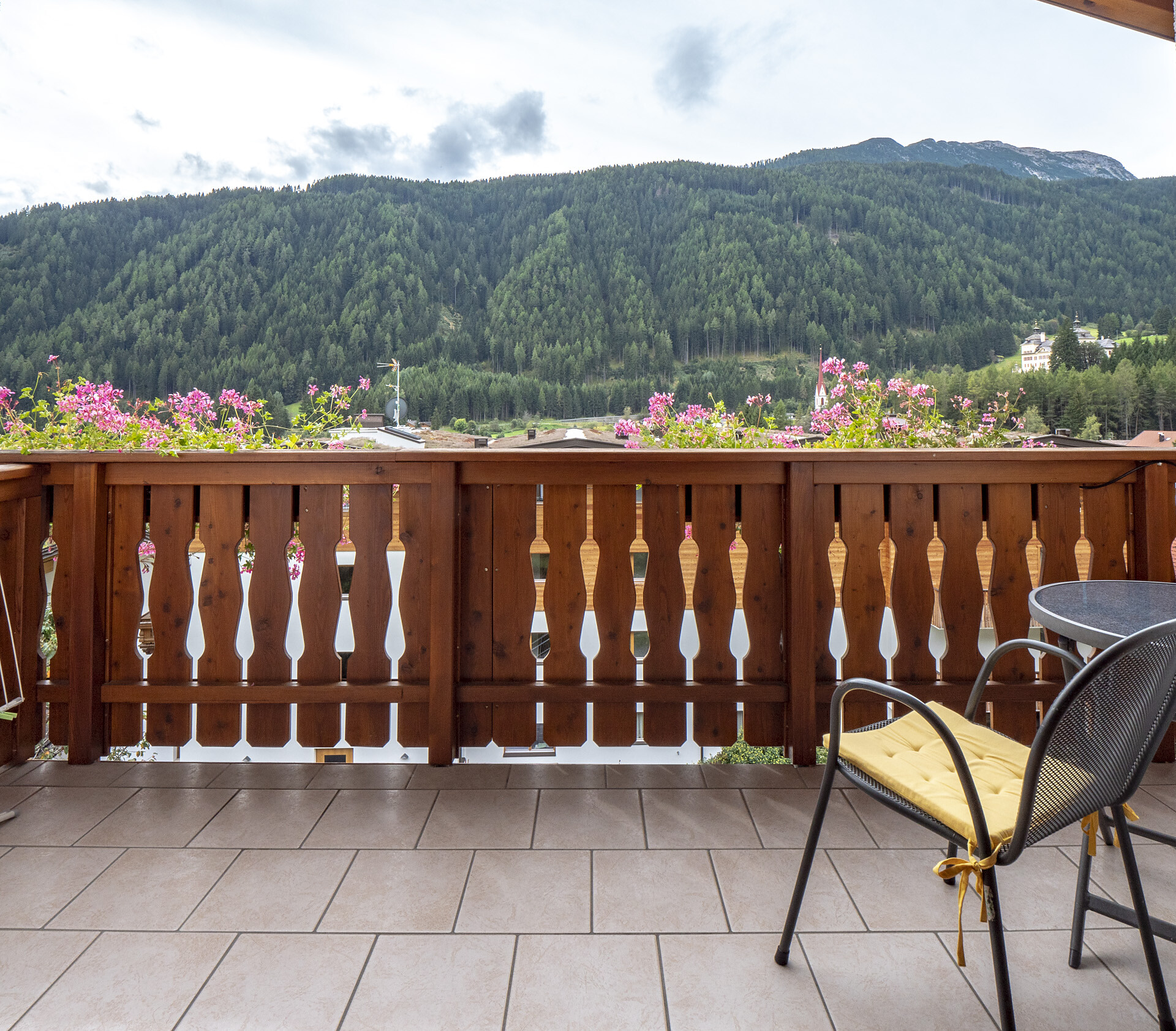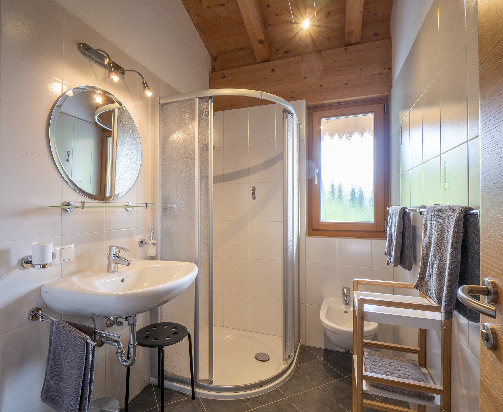 Anche nel bagno non manca nulla: WC, lavandino con mensola e specchio, doccia e bidet. Lo speciale dell'appartamento "Sunny" è la grande terrazza esposta a sud-est di 9 m², che invita a fare colazione all'aperto ed è il luogo ideale per godersi la tranquillità della natura.