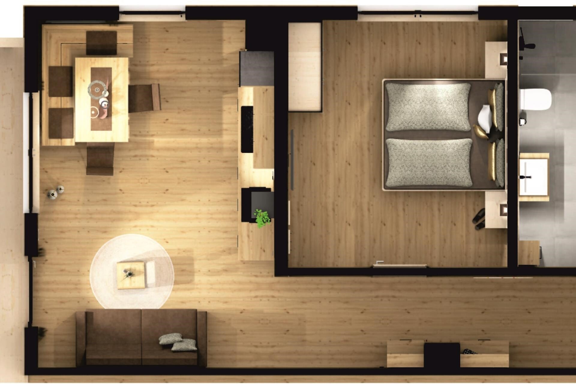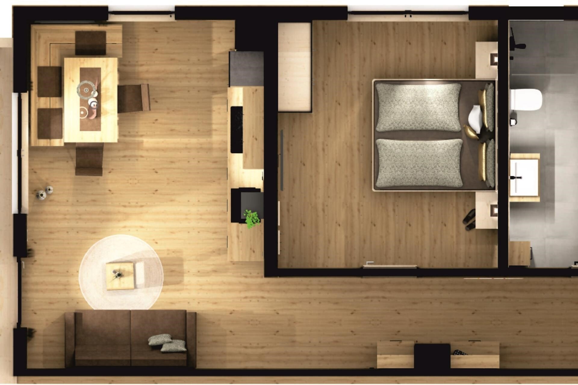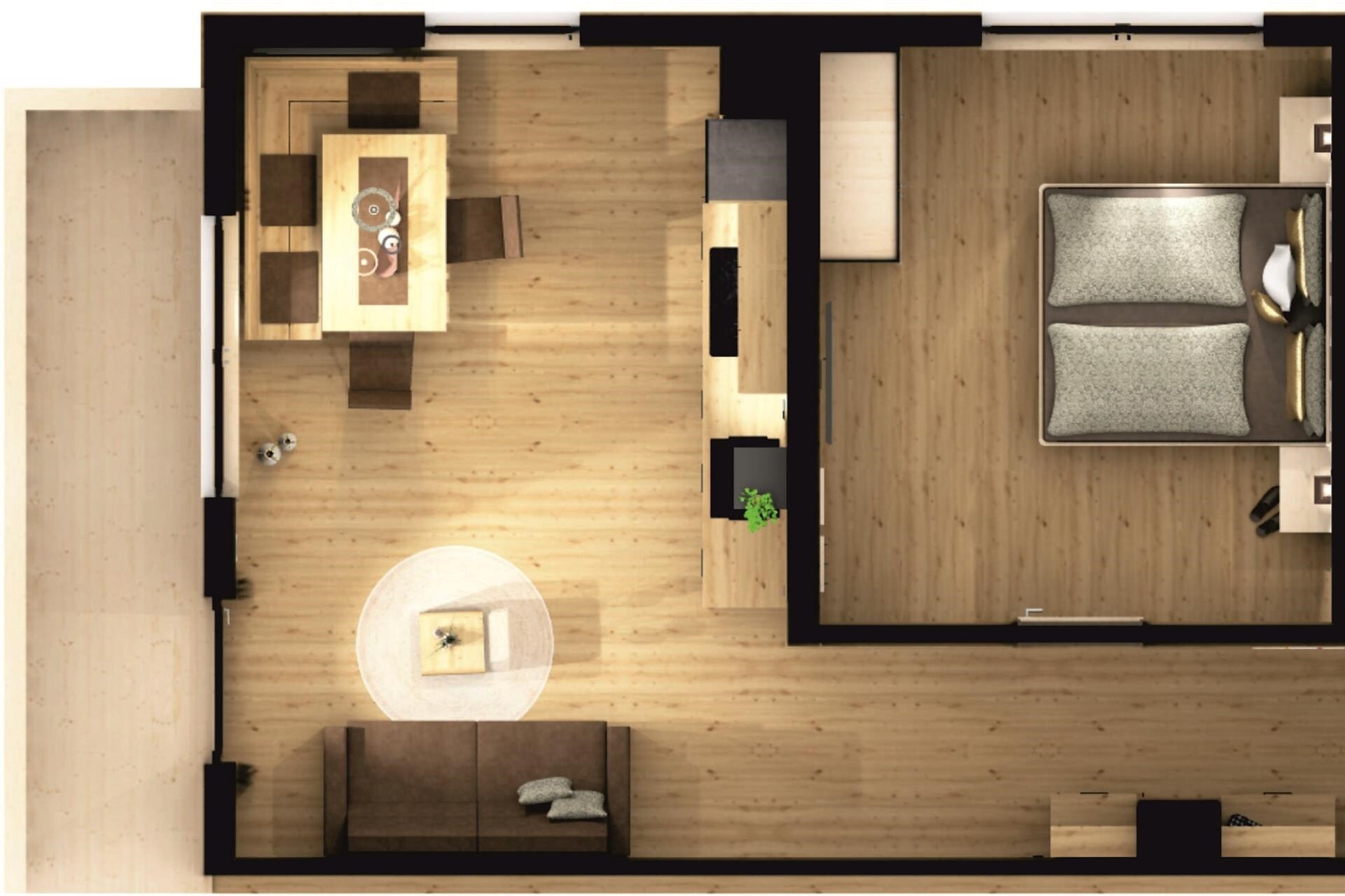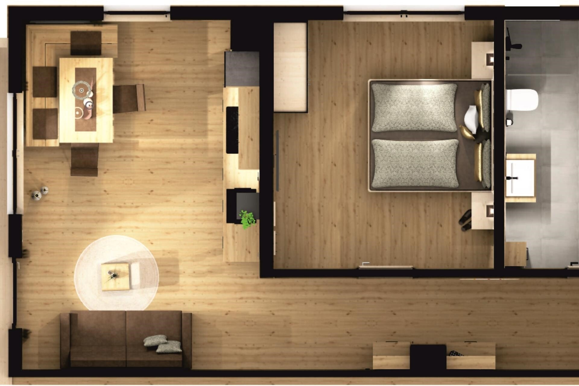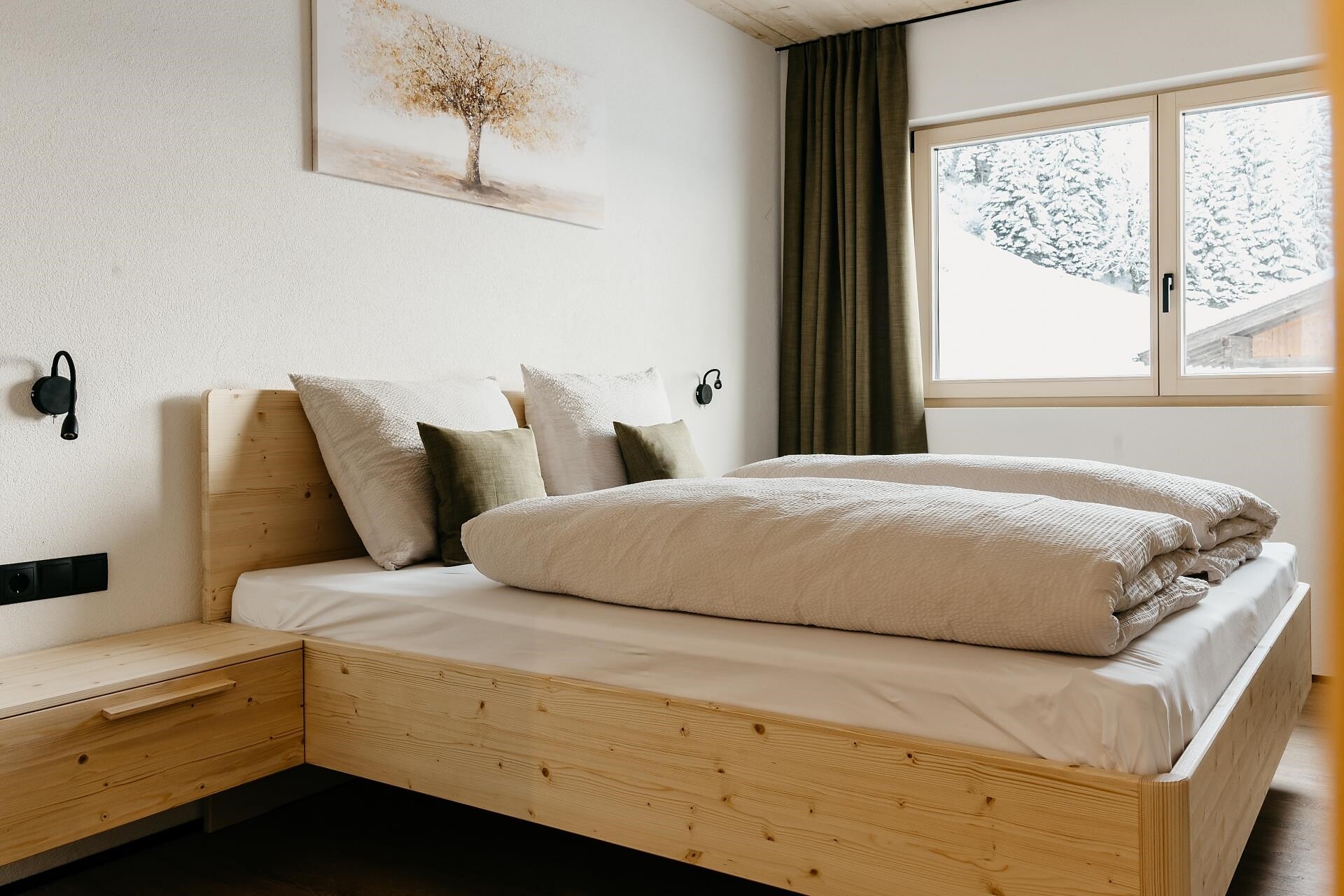 Gli appartamenti vacanza, con una superficie di 60 m², offrono spazio e comfort per ospiti esigenti. Dispongono di una camera da letto, un soggiorno con divano letto matrimoniale, un ampio bagno con doccia a pioggia e un grande balcone con una vista mozzafiato. Immersi nella natura e nella tranquillità, potrete godervi momenti di puro relax.