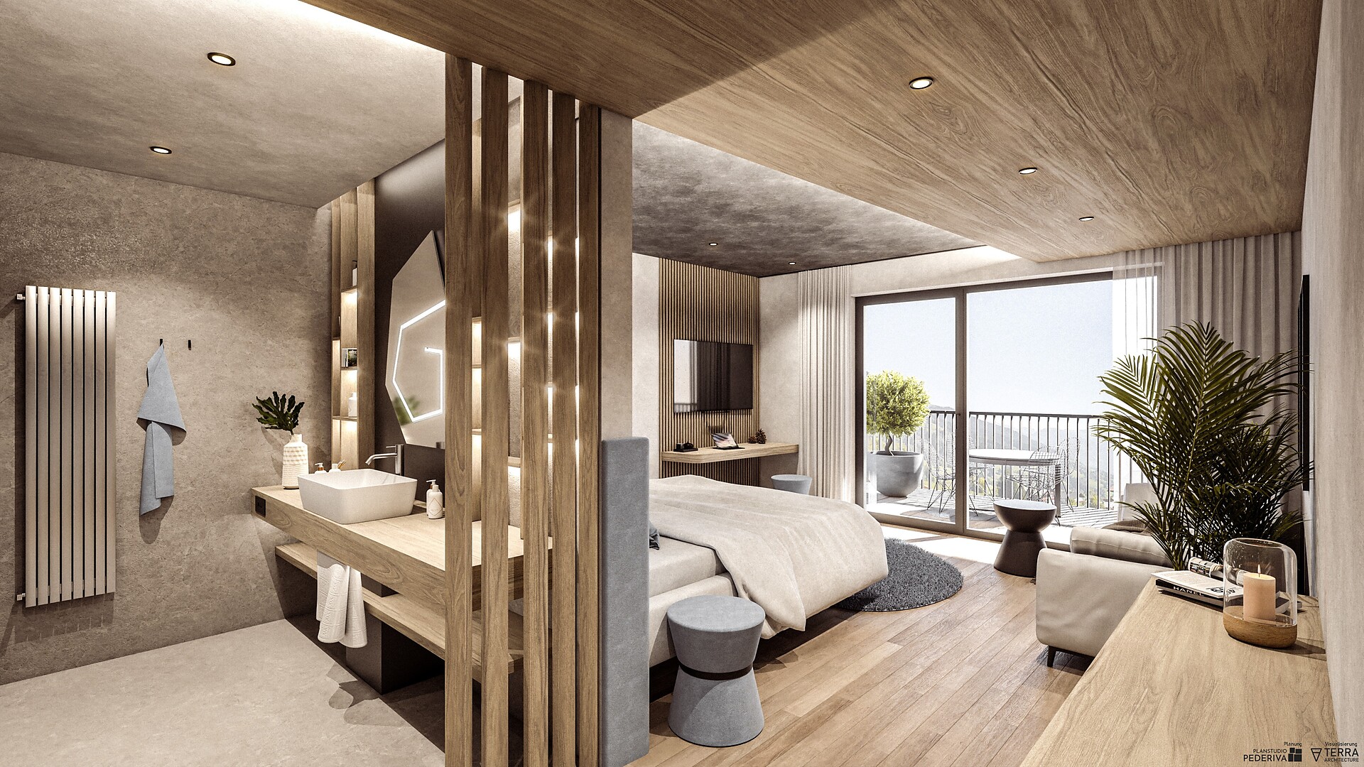 Suite con grande balcone e ampio open space zona giorno/notte con letto matrimoniale e divano, pavimento in legno, vetrata panoramica, bagno con grande doccia, WC e bidet, asciugacapelli, telefono, cassaforte, TV LCD, frigobar, WiFi, posto auto in garage. I cani non sono ammessi!