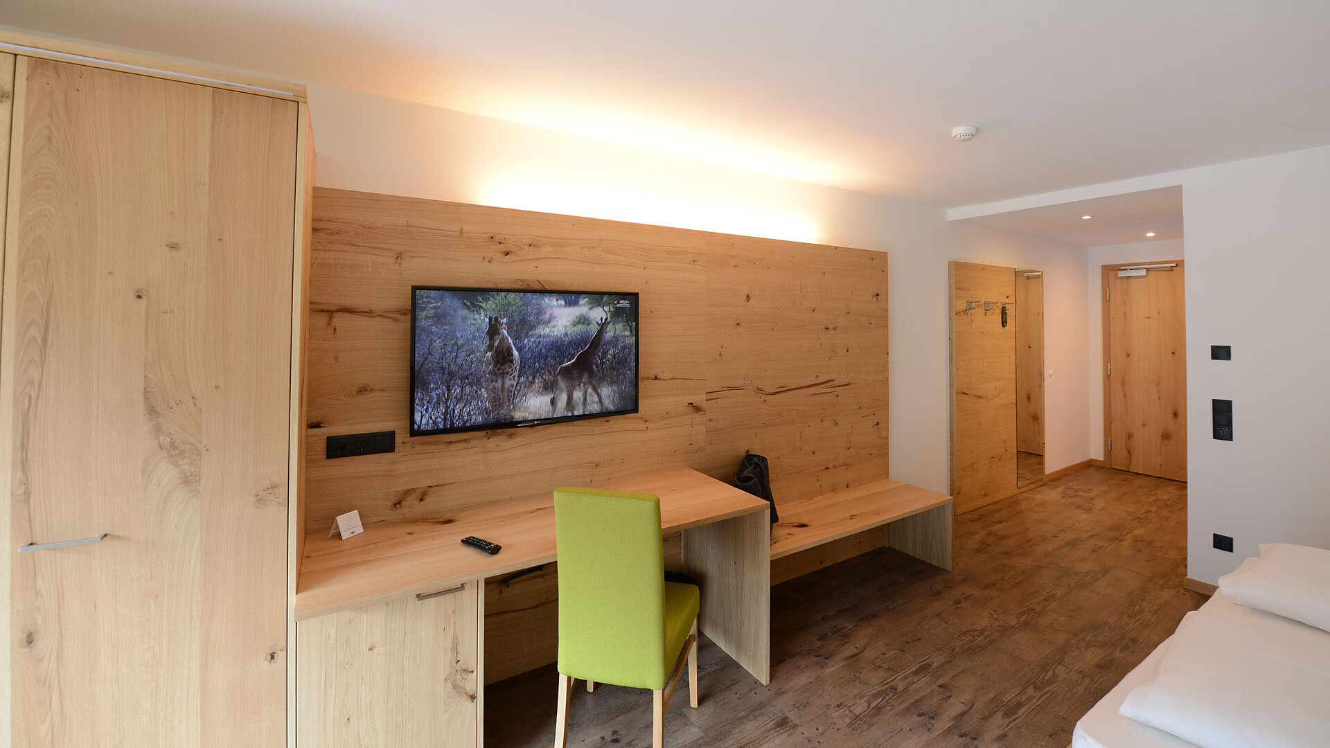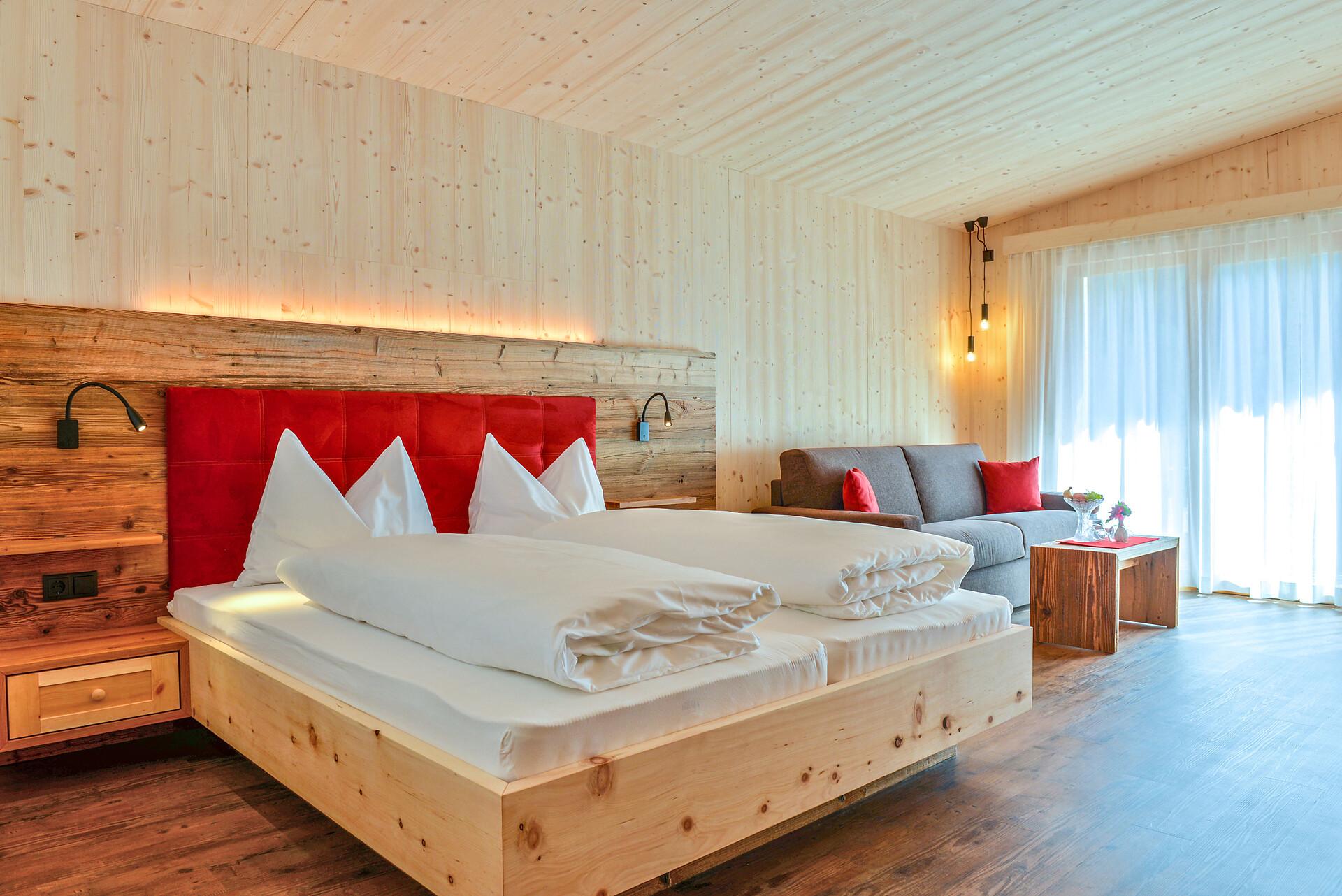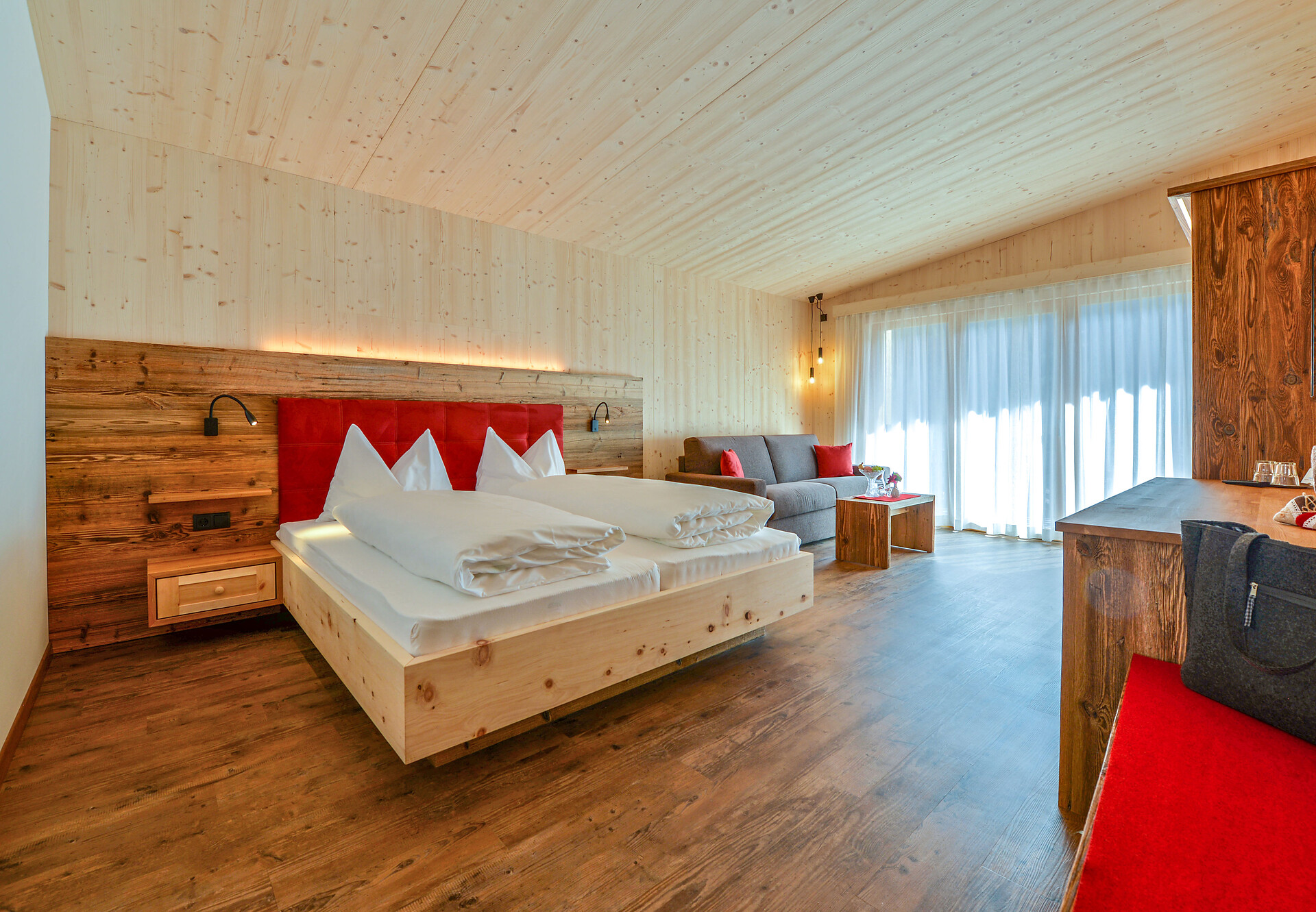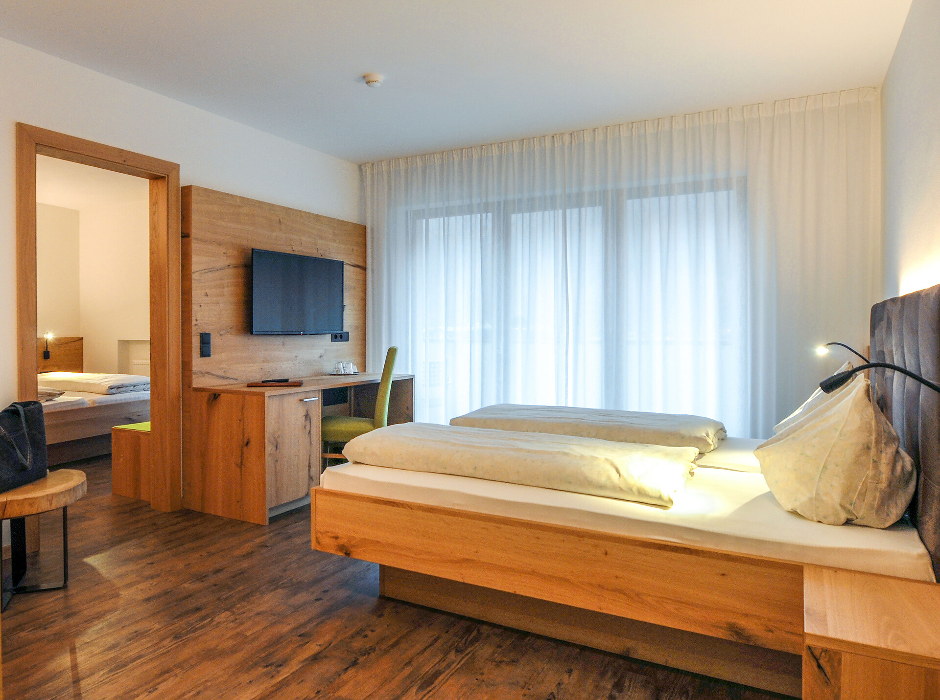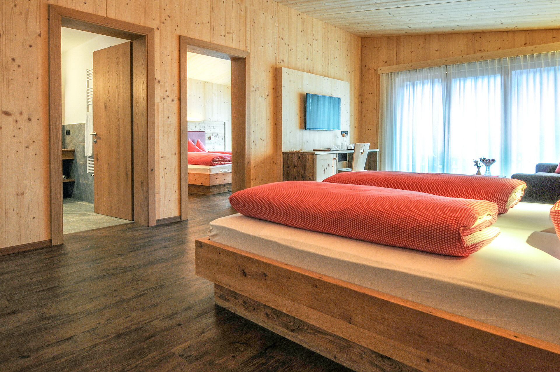 La nostra nuova Family Suite per 4-5 persone (ca. 45m²) con balcone vista Valle, in stile alpino moderno, offre due stanze separate e un bagno spazioso dotato di ampia doccia, WC, bidet, asciugacapelli. La camera è dotata di pavimente in legno, offre l’utilizzo gratuito del WiFi, 2 tv (43") a schermo piatto, cassaforte, scrivania e un divano utilizzabile, su richiesta, come possibile doppio letto aggiuntivo. Una borsa wellness con morbidi asciugamani per sauna e piscina sono a sua disposizione in camera.