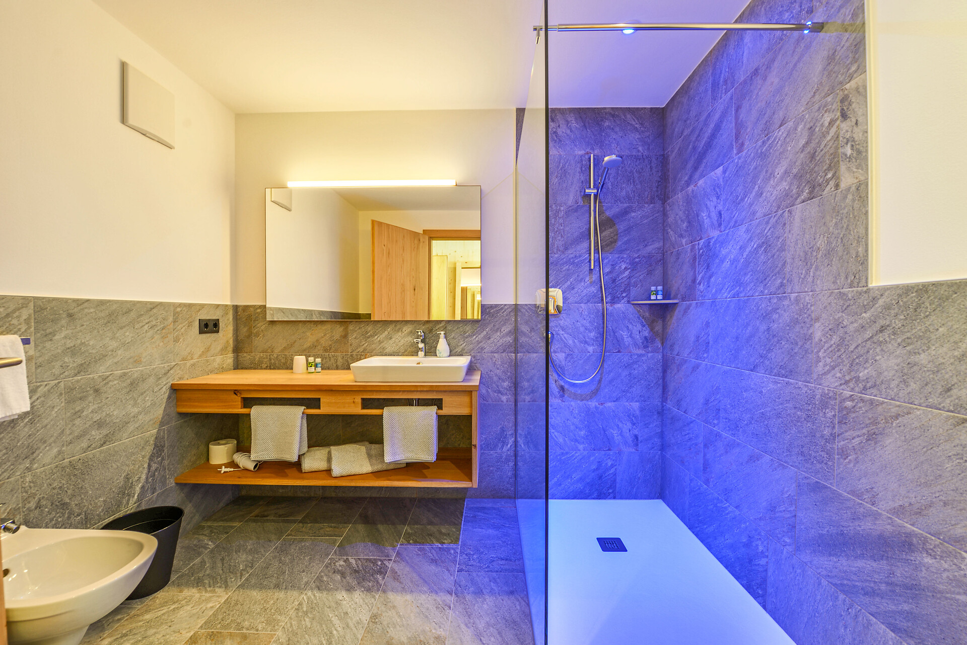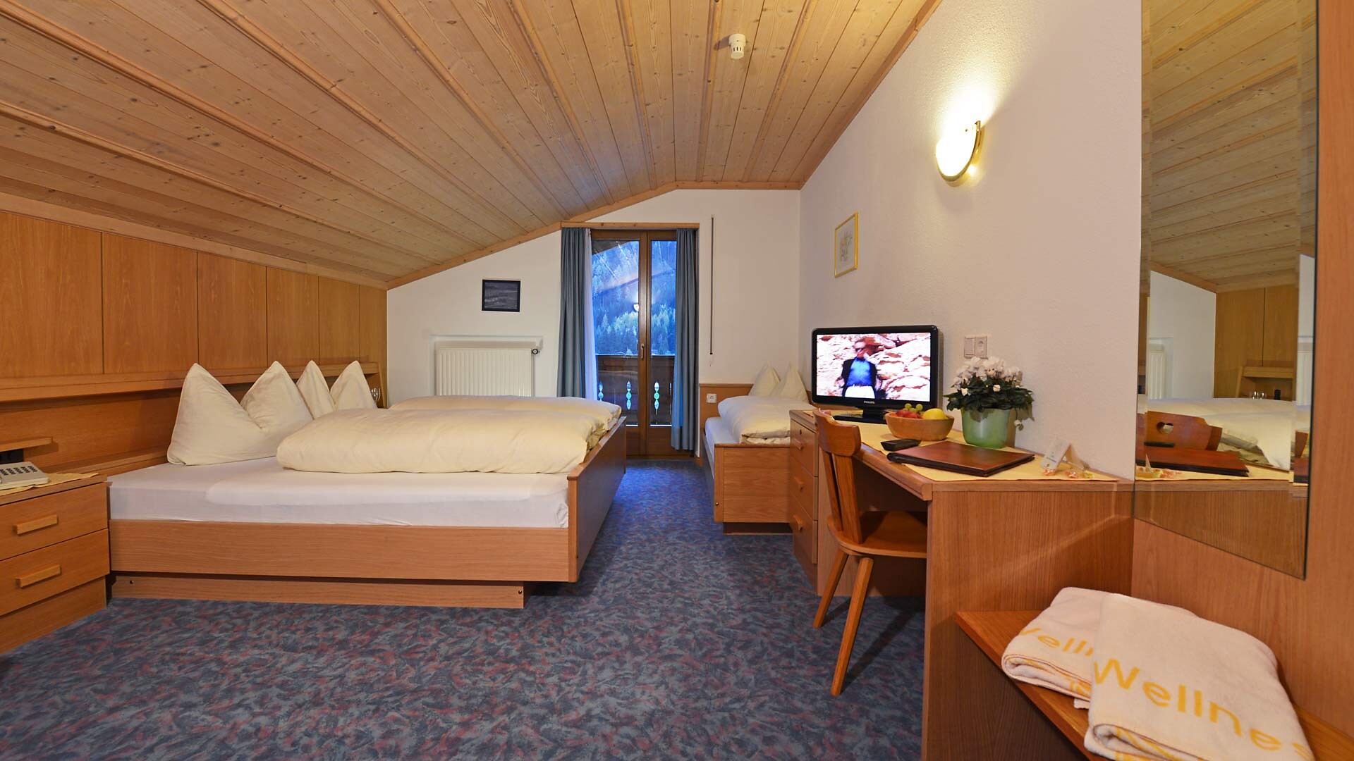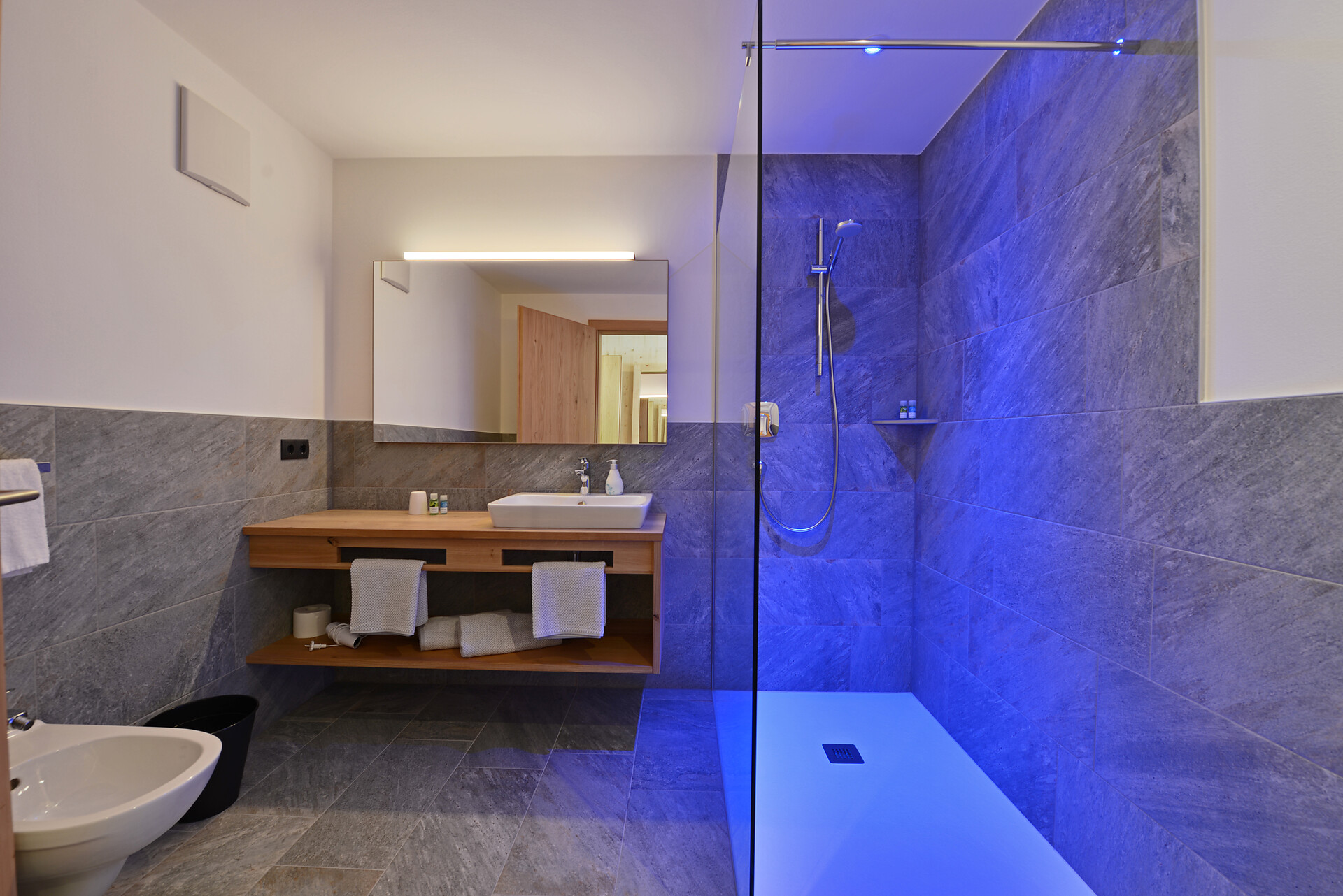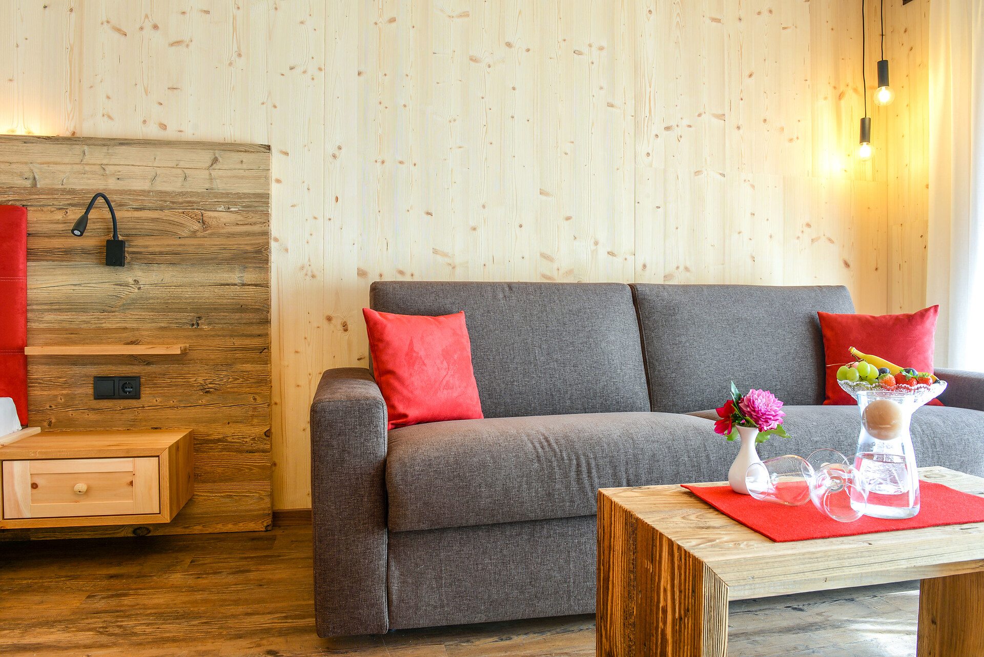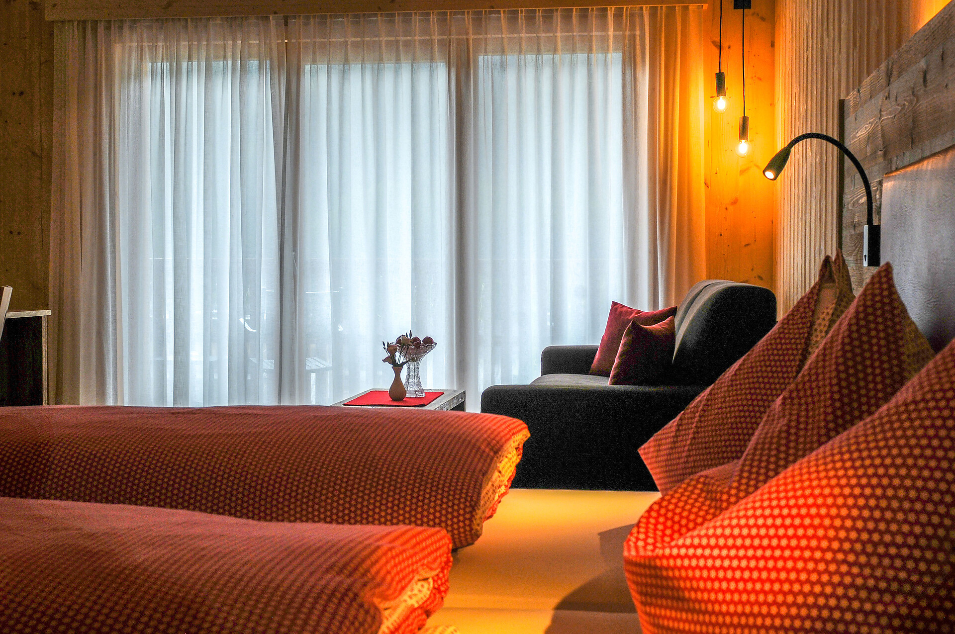 La nostra nuova Family Suite per 4-5 persone (ca. 45m²) con balcone vista Valle, in stile alpino moderno, offre due stanze separate e un bagno spazioso dotato di ampia doccia, WC, bidet, asciugacapelli. La camera è dotata di pavimente in legno, offre l’utilizzo gratuito del WiFi, 2 tv (43") a schermo piatto, cassaforte, scrivania e un divano utilizzabile, su richiesta, come possibile doppio letto aggiuntivo. Una borsa wellness con morbidi asciugamani per sauna e piscina sono a sua disposizione in camera.