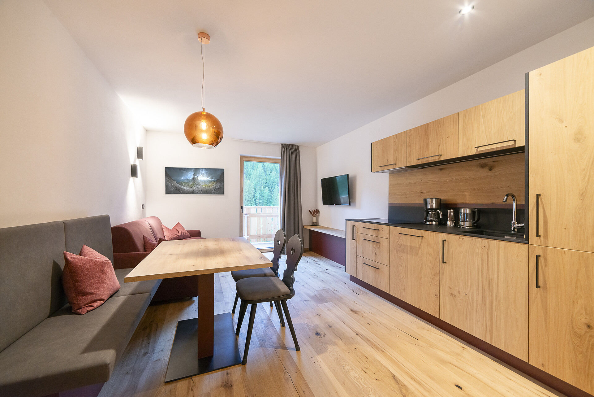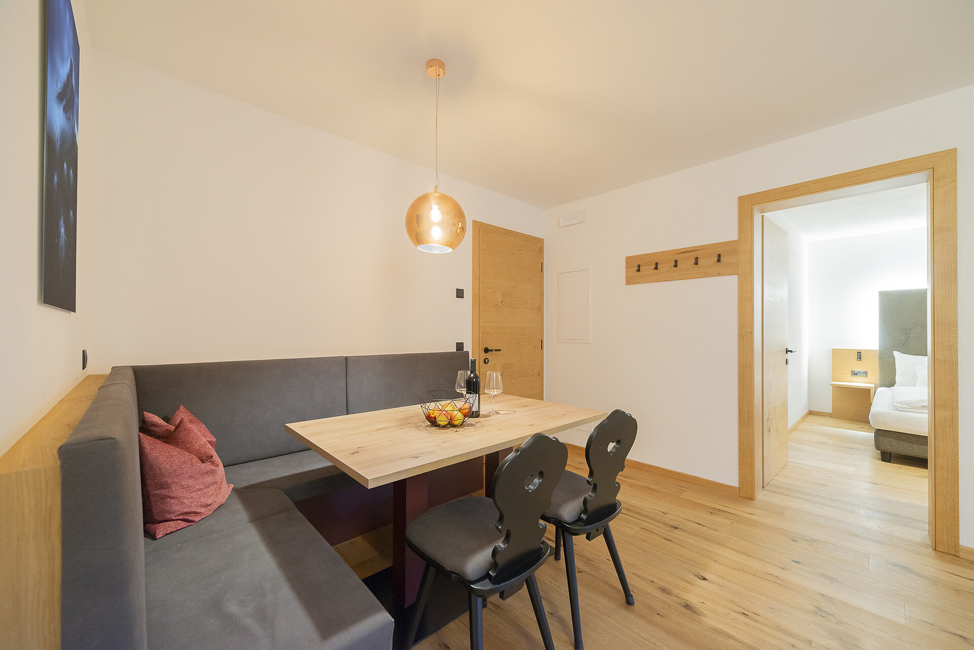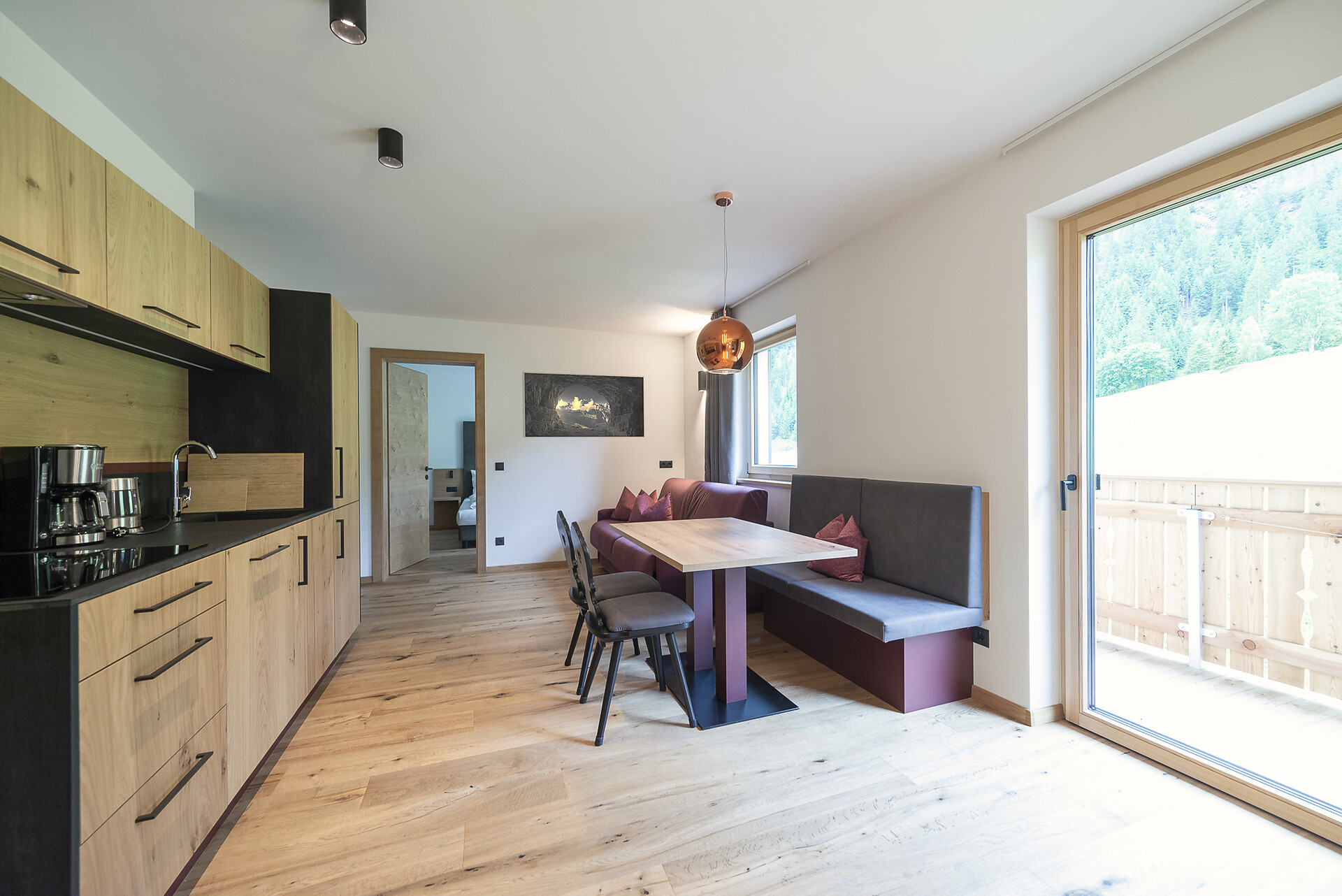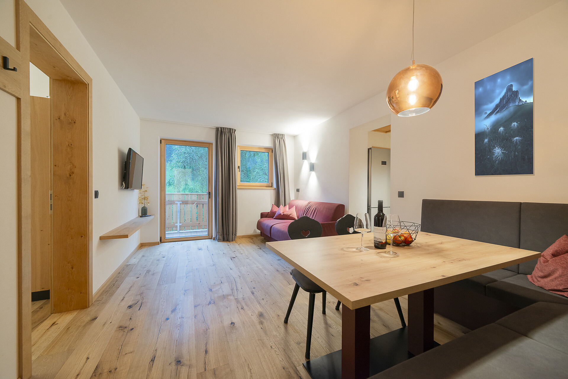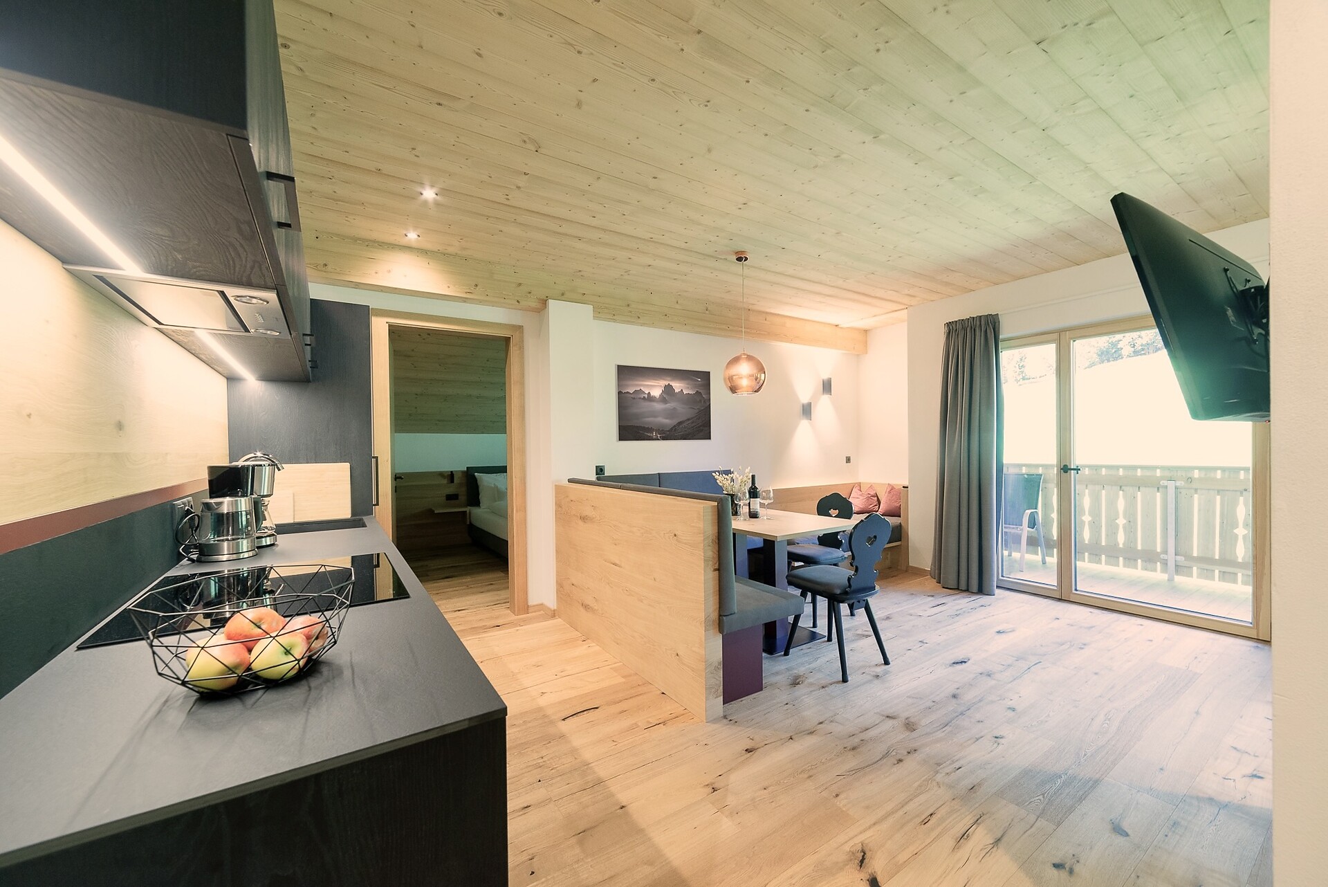 Vi aspetta un nuovissimo appartamento completamente attrezzato con cucina-soggiorno (piano cottura a induzione, frigorifero, lavastoviglie, macchina per il caffè, bollitore, stoviglie, utensili da cucina), zona salotto, Smart TV 42'', una camera da letto con letto king-size, un divano letto nel soggiorno e un ampio balcone in legno naturale con vista sulle montagne e il comprensorio sciistico di Racines-Giovo. Il pavimento, realizzato in legno massiccio di quercia, è riscaldato e offre una piacevole esperienza abitativa. Il bagno raffinato, con piastrelle scure e una doccia a pioggia, attira l'attenzione.