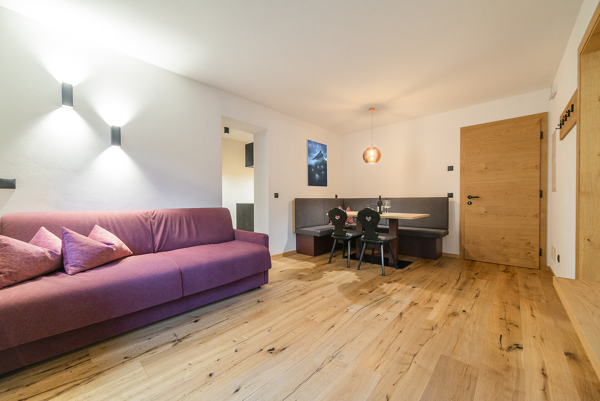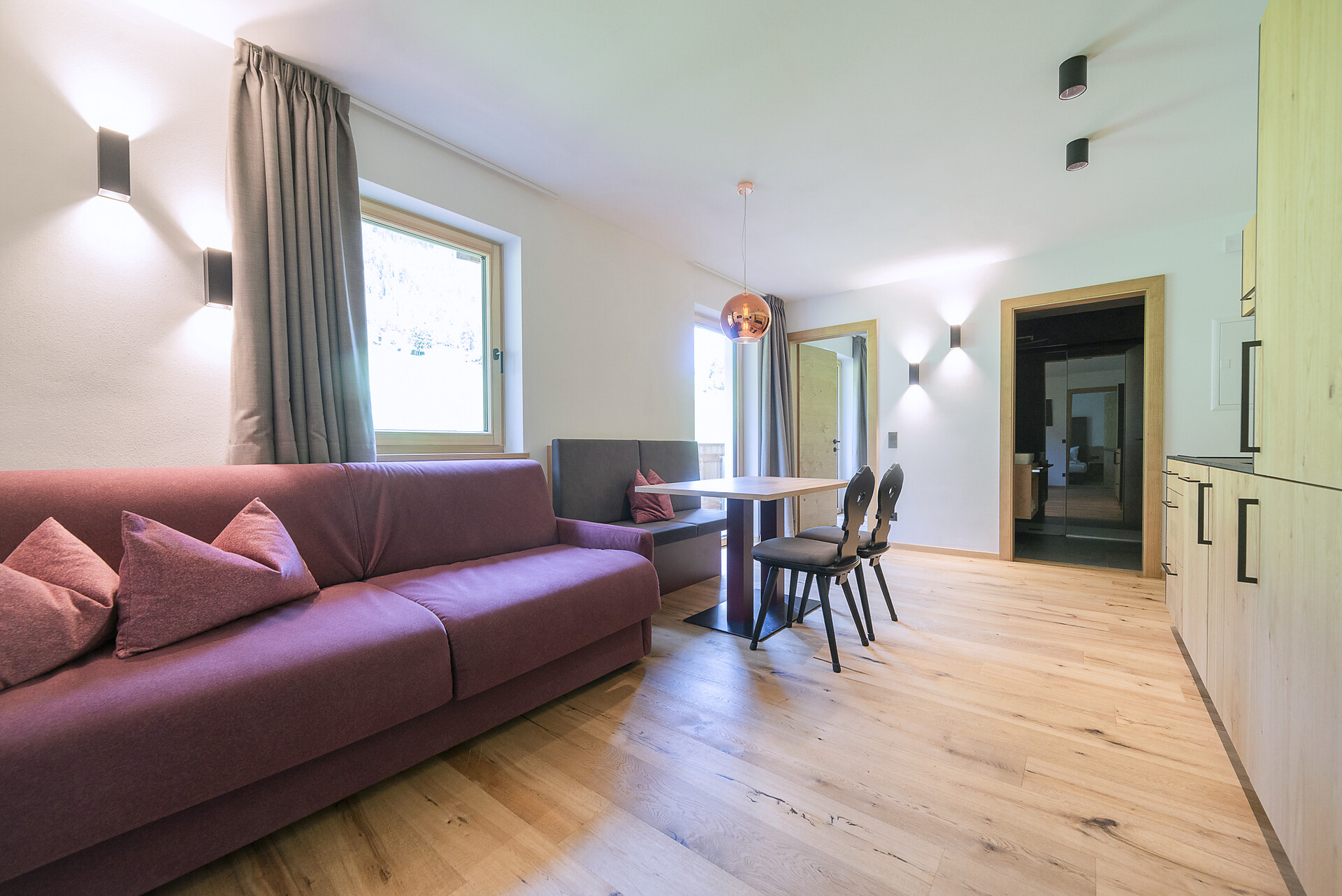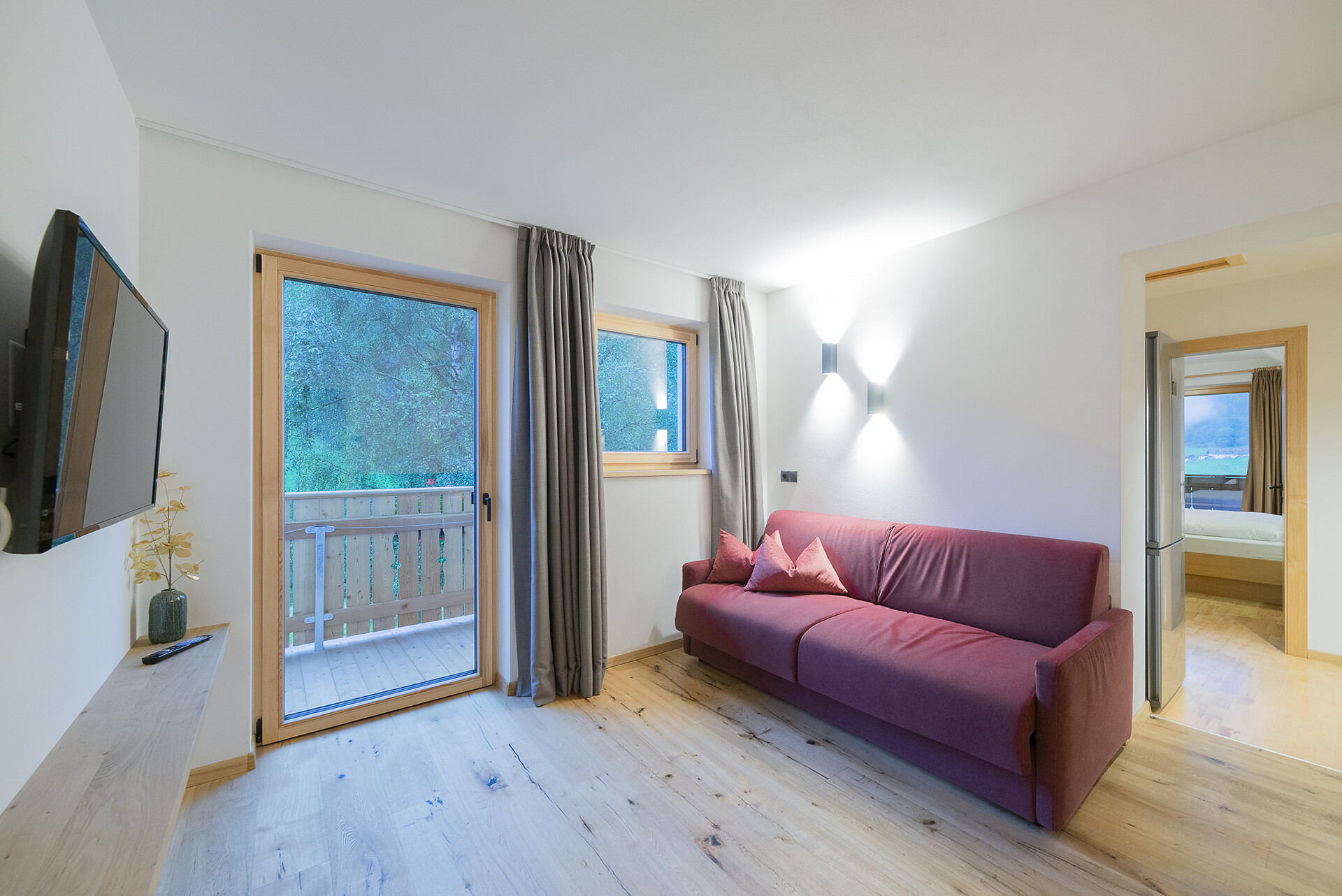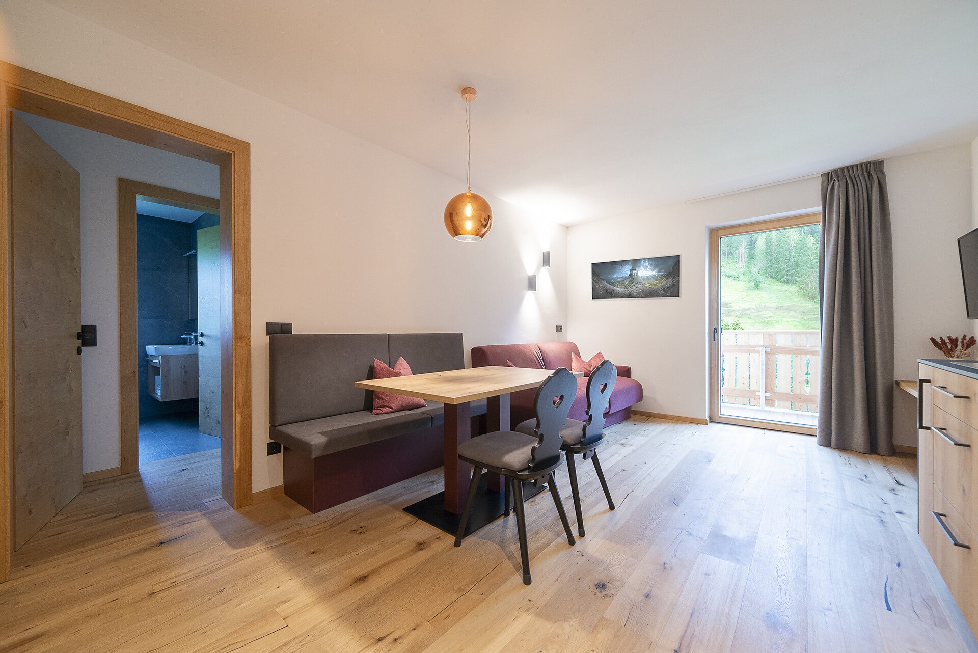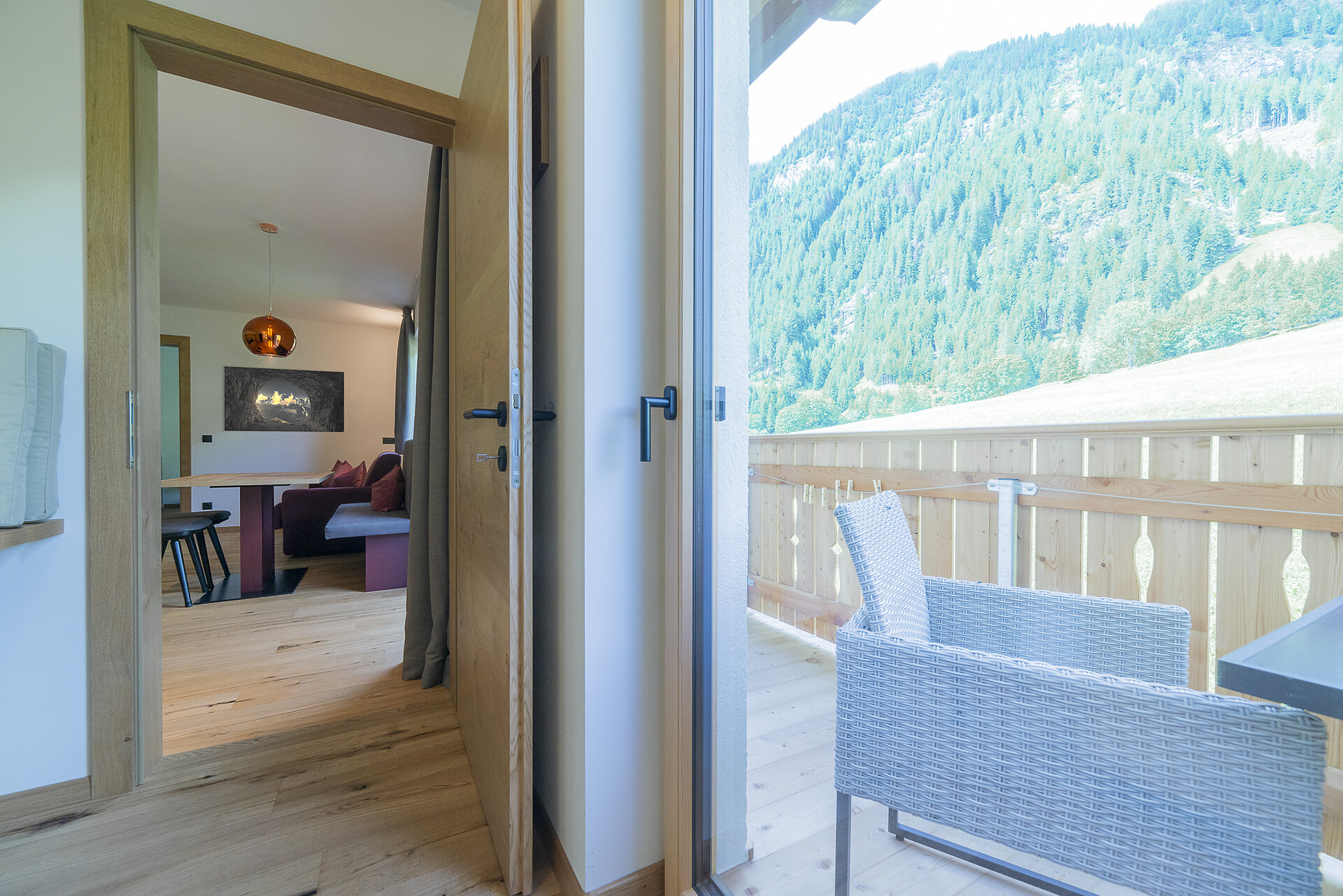 Vi aspetta un nuovissimo appartamento completamente attrezzato con cucina-soggiorno (piano cottura a induzione, frigorifero, lavastoviglie, macchina per il caffè, bollitore, stoviglie, utensili da cucina), zona salotto, Smart TV 42'', una camera da letto con letto king-size, un divano letto nel soggiorno e un ampio balcone in legno naturale con vista sulle montagne e il comprensorio sciistico di Racines-Giovo. Il pavimento, realizzato in legno massiccio di quercia, è riscaldato e offre una piacevole esperienza abitativa. Il bagno raffinato, con piastrelle scure e una doccia a pioggia, attira l'attenzione.