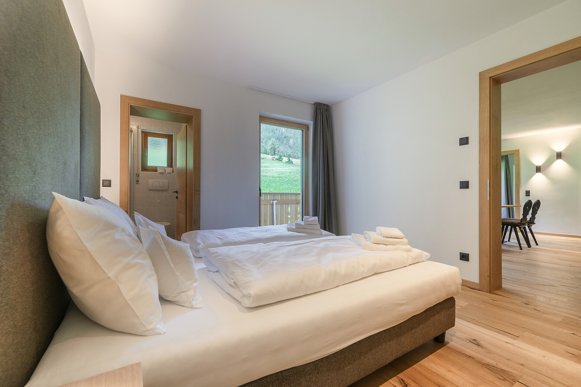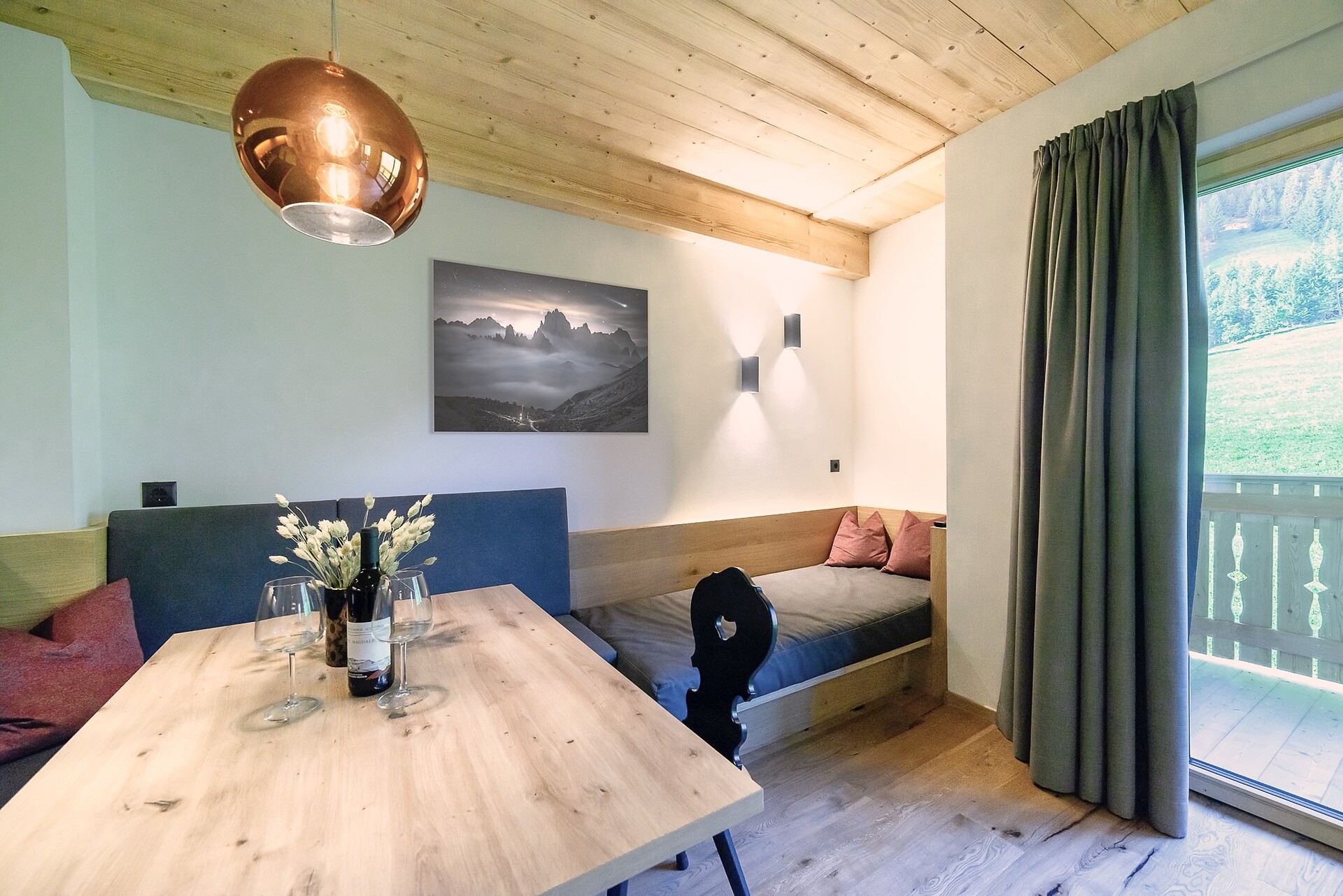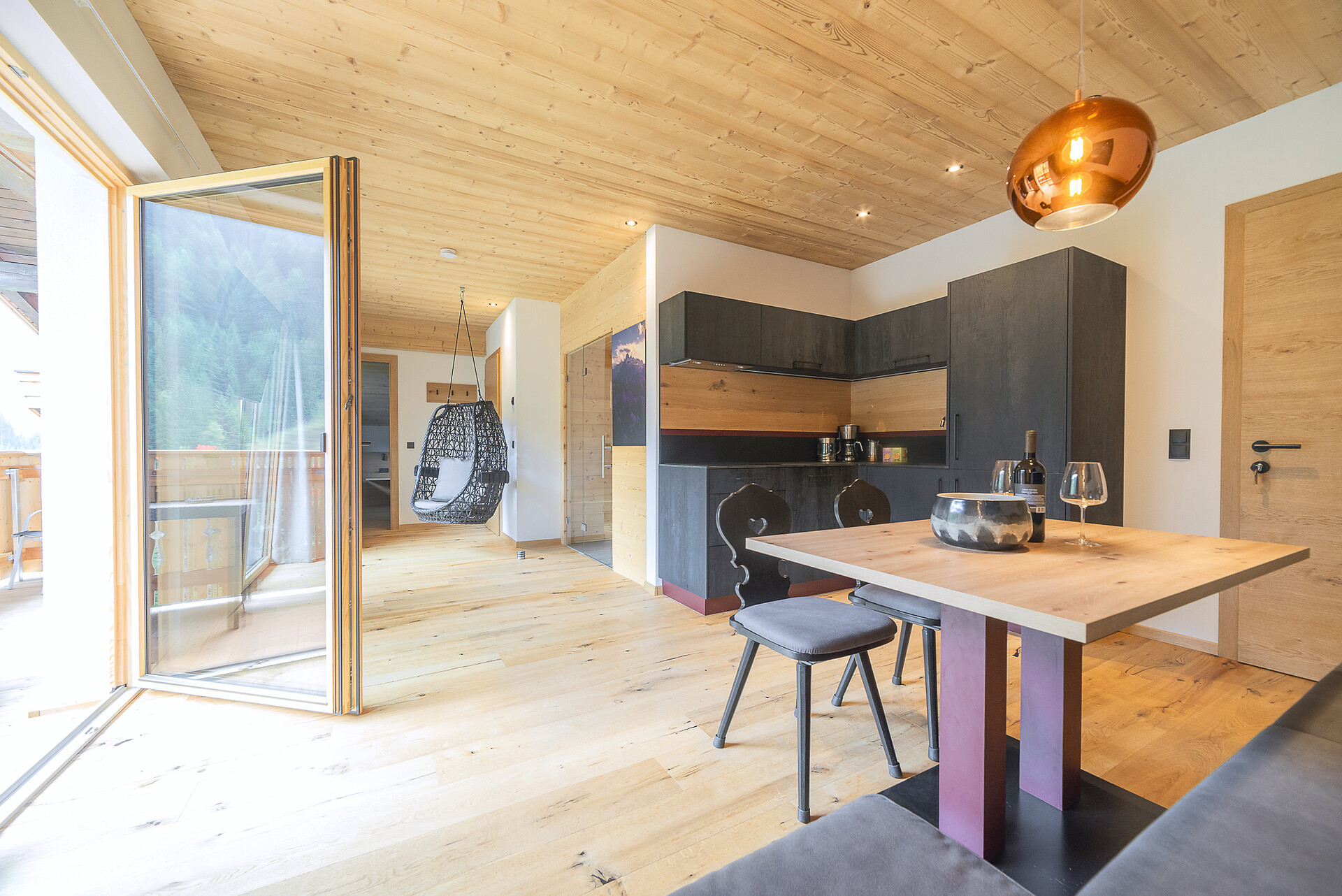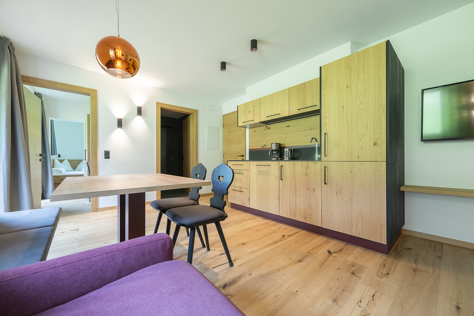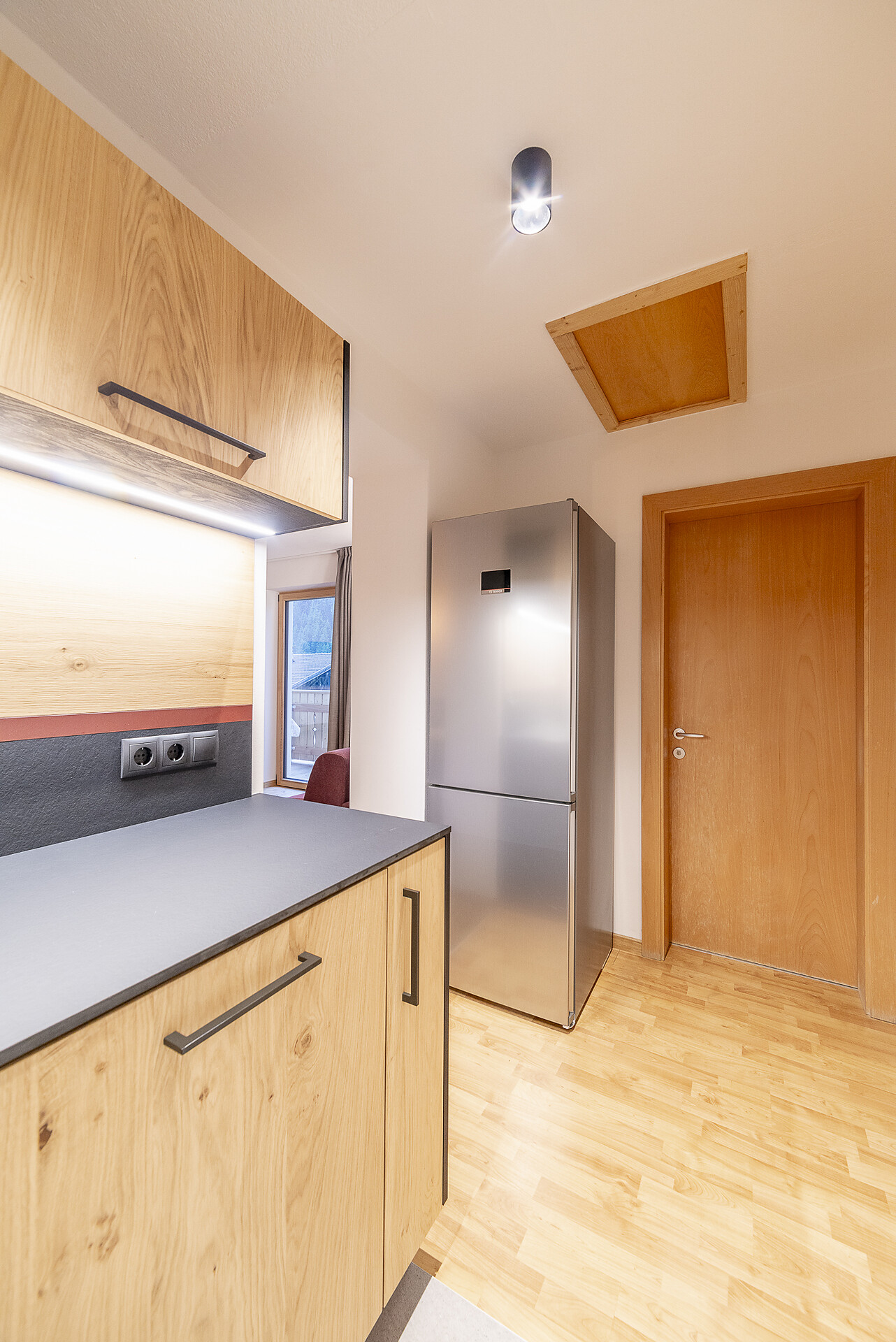 Vi aspetta un nuovissimo appartamento completamente attrezzato con cucina-soggiorno (piano cottura a induzione, frigorifero, lavastoviglie, macchina per il caffè, bollitore, stoviglie, utensili da cucina), zona salotto, Smart TV 42'', una camera da letto con letto king-size, un divano letto nel soggiorno e un ampio balcone in legno naturale con vista sulle montagne e il comprensorio sciistico di Racines-Giovo. Il pavimento, realizzato in legno massiccio di quercia, è riscaldato e offre una piacevole esperienza abitativa. Il bagno raffinato, con piastrelle scure e una doccia a pioggia, attira l'attenzione.