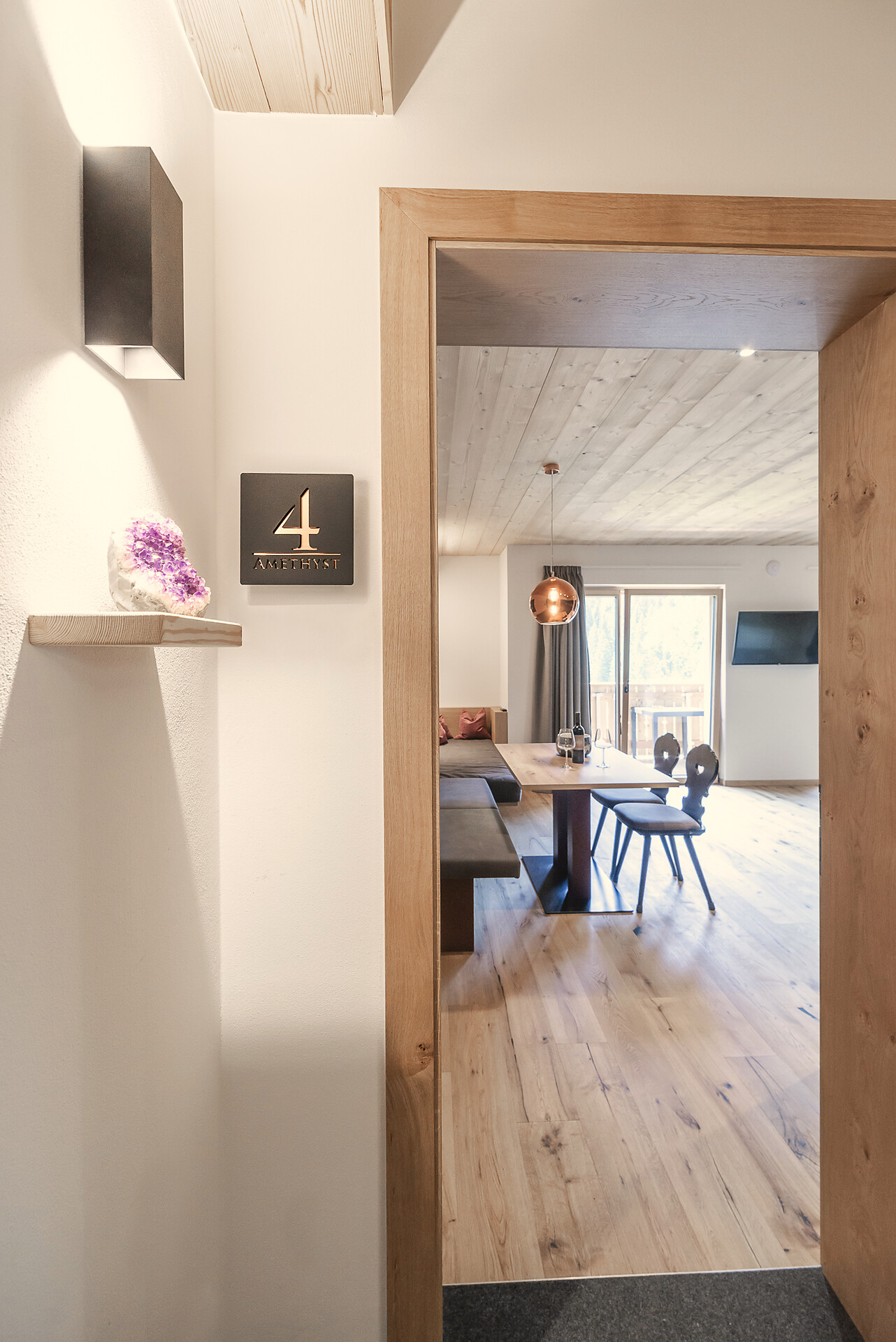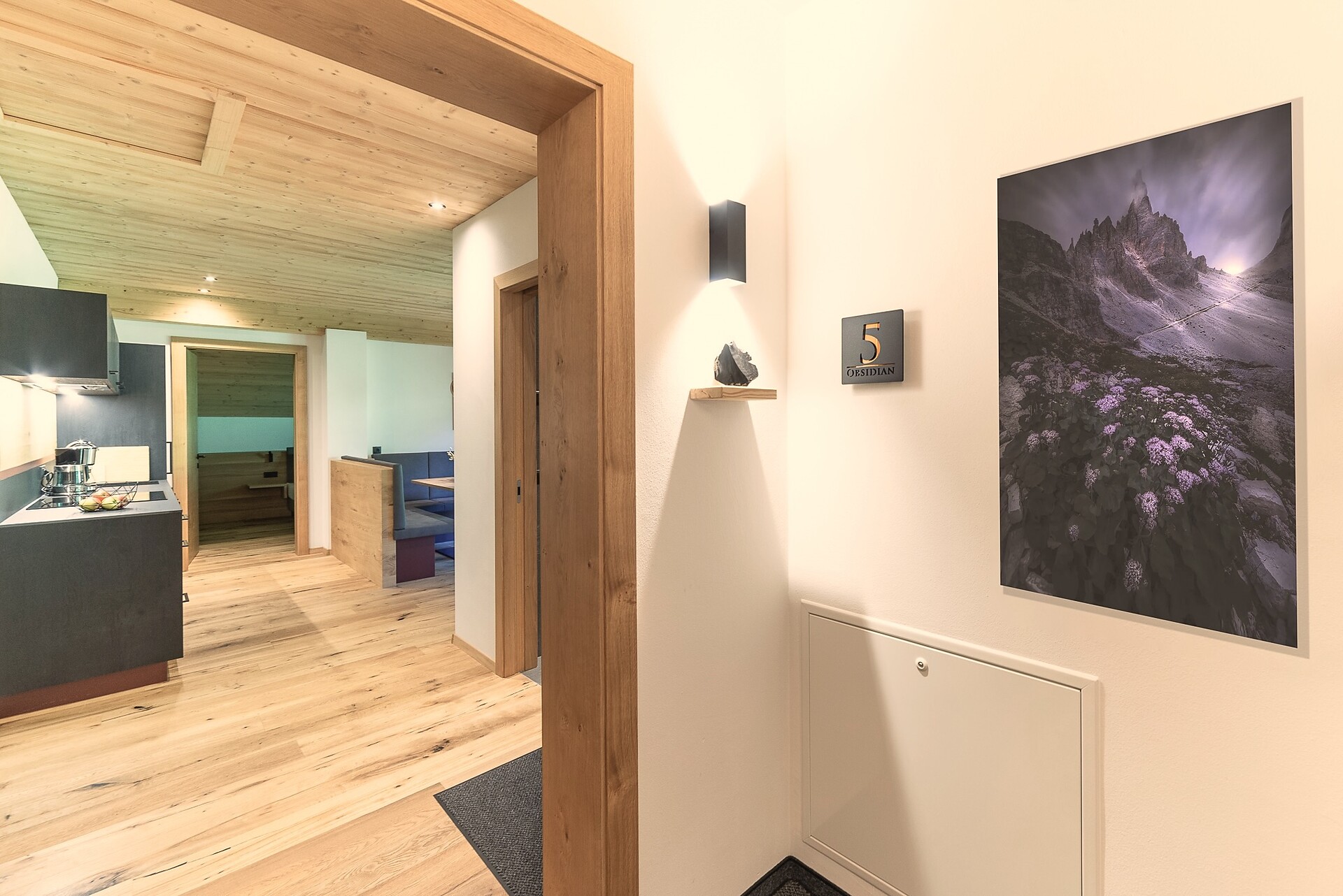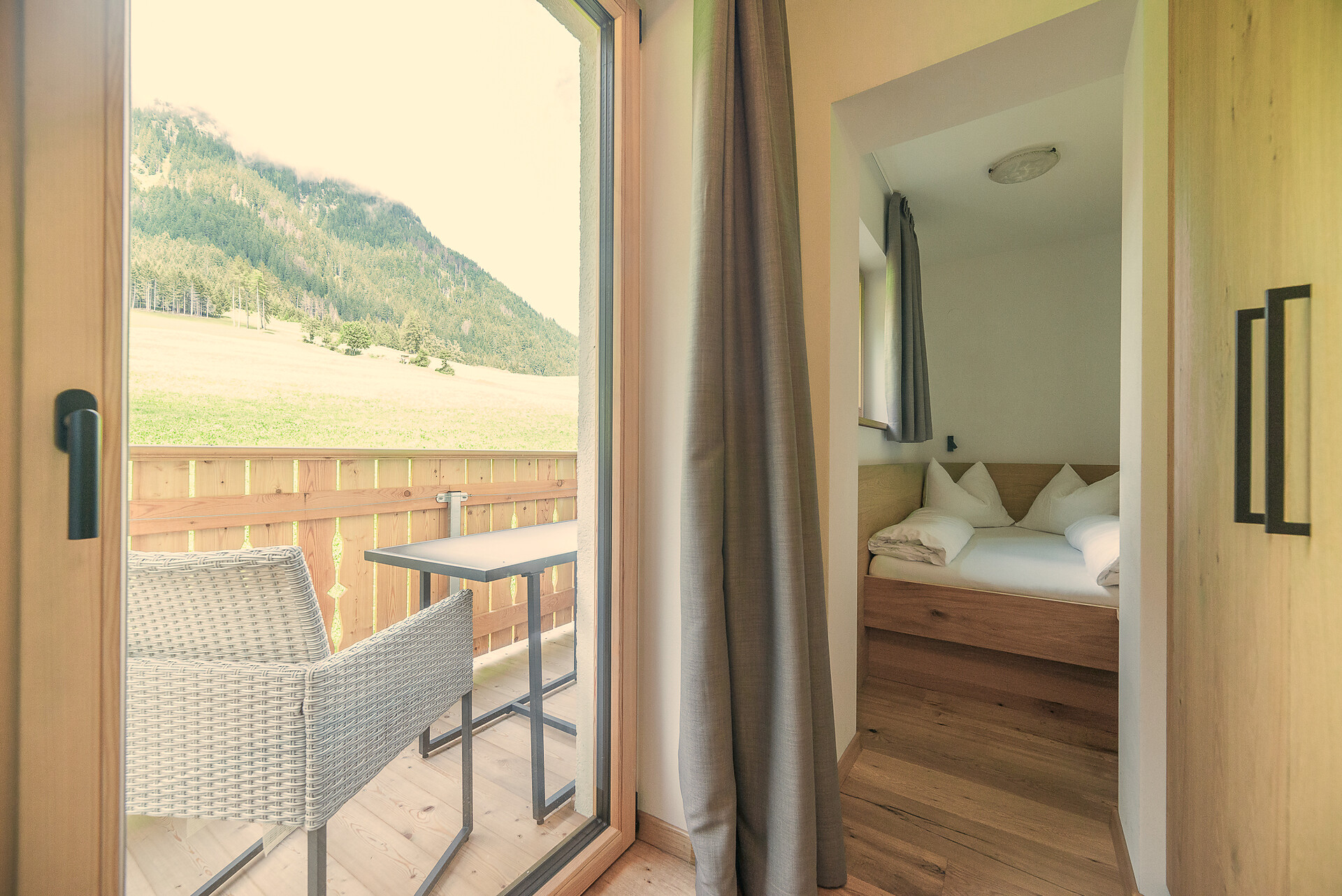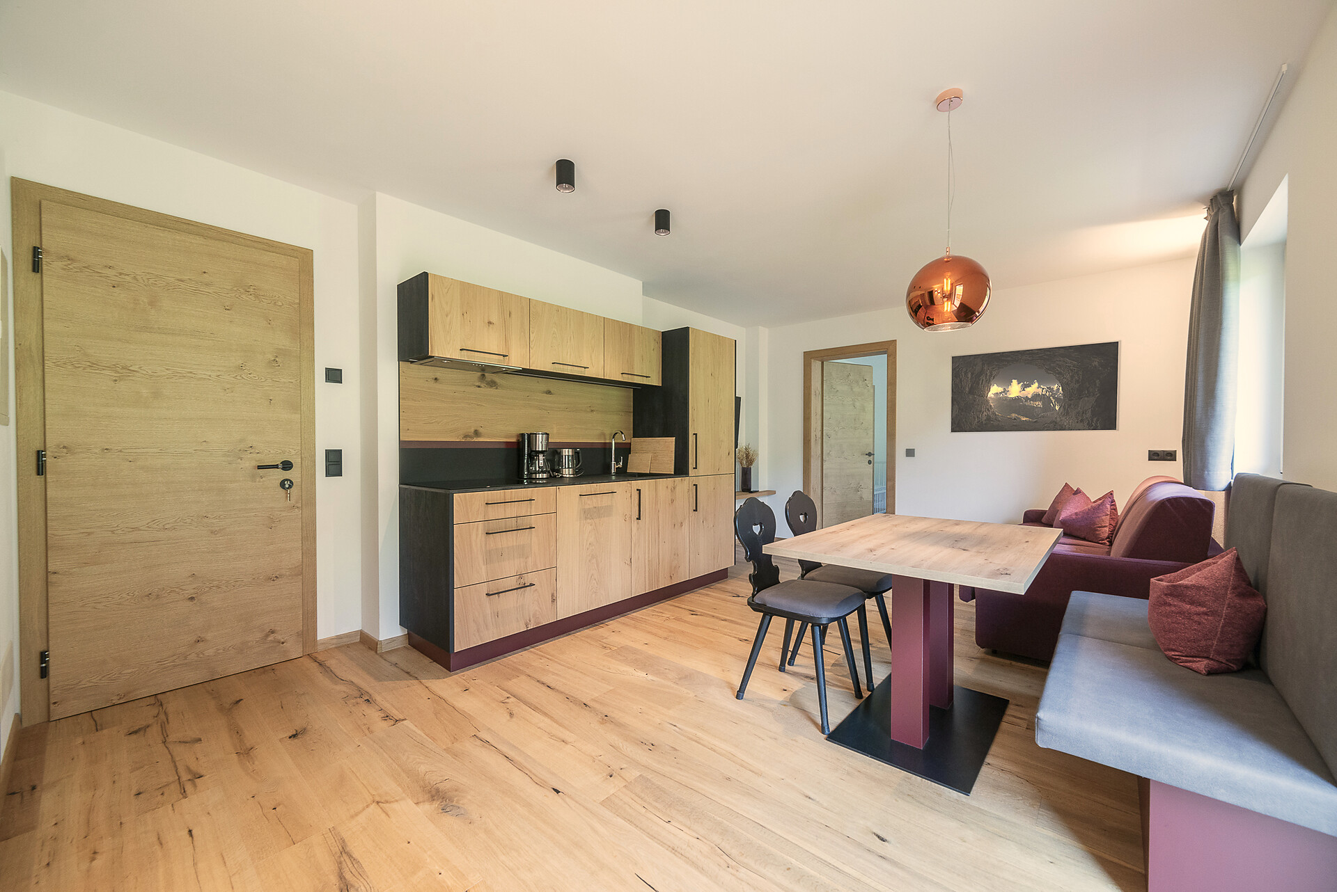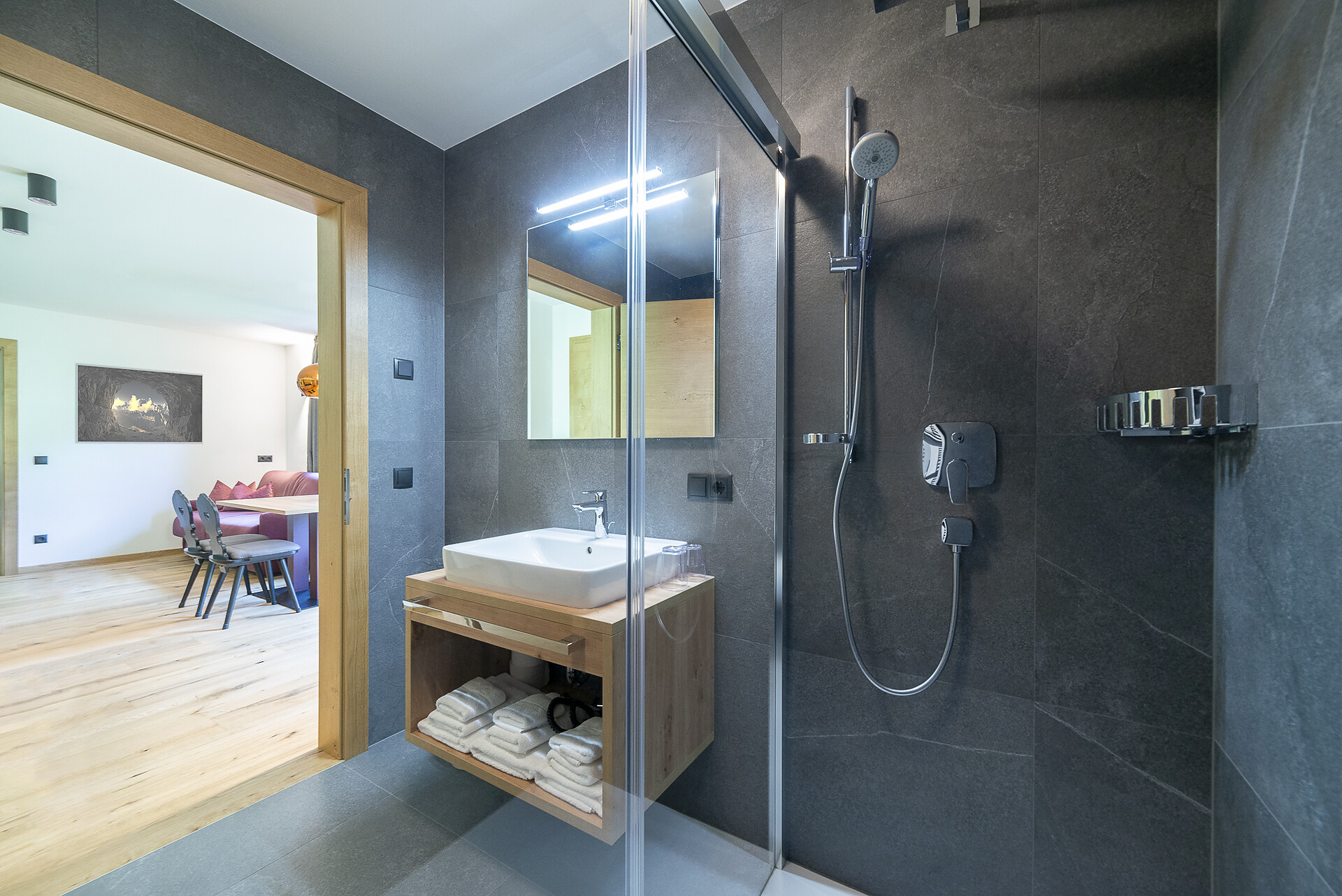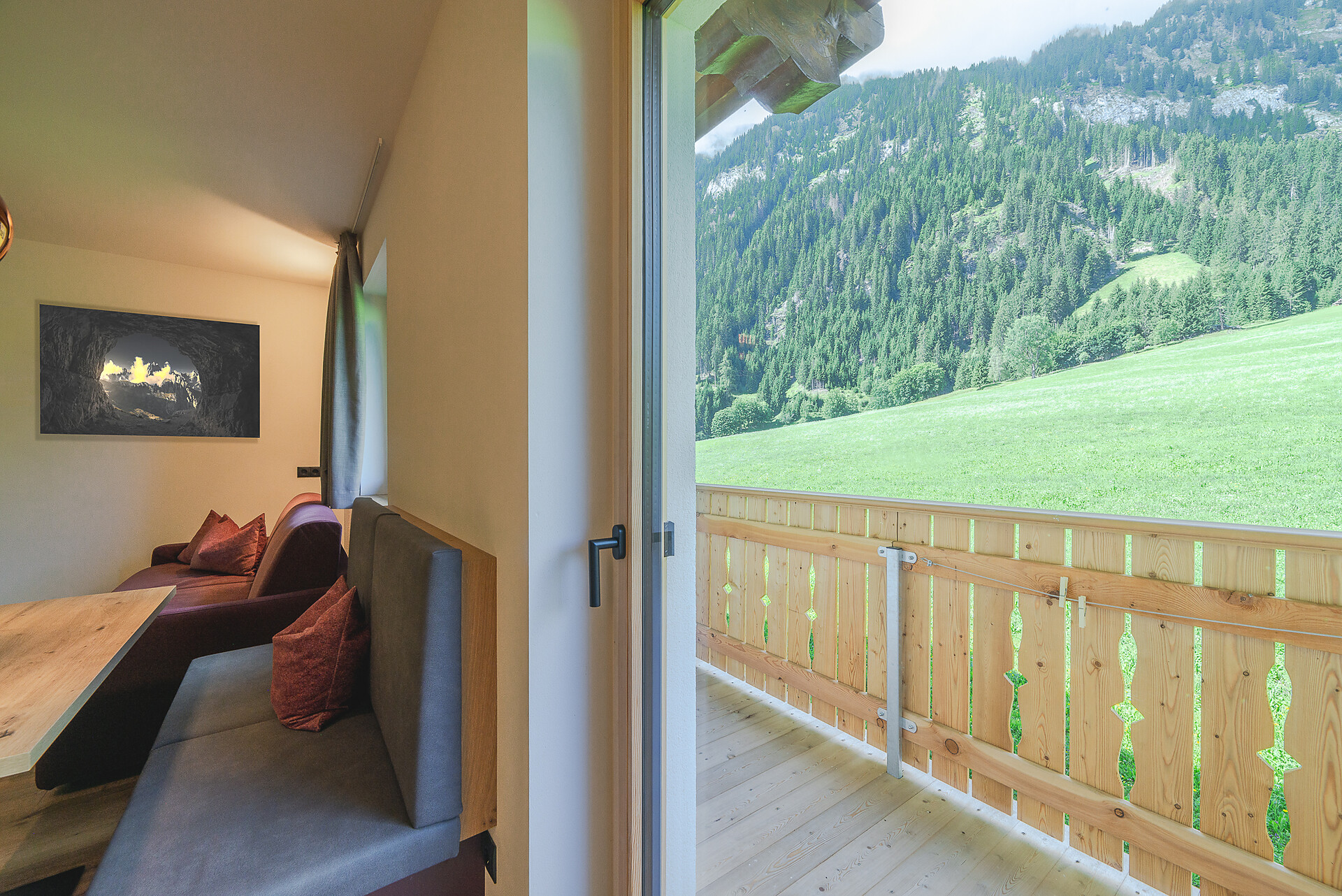 Vi aspetta un nuovissimo appartamento completamente attrezzato con cucina-soggiorno (piano cottura a induzione, frigorifero, lavastoviglie, macchina per il caffè, bollitore, stoviglie, utensili da cucina), zona salotto, Smart TV 42'', una camera da letto con letto king-size, un divano letto nel soggiorno e un ampio balcone in legno naturale con vista sulle montagne e il comprensorio sciistico di Racines-Giovo. Il pavimento, realizzato in legno massiccio di quercia, è riscaldato e offre una piacevole esperienza abitativa. Il bagno raffinato, con piastrelle scure e una doccia a pioggia, attira l'attenzione.