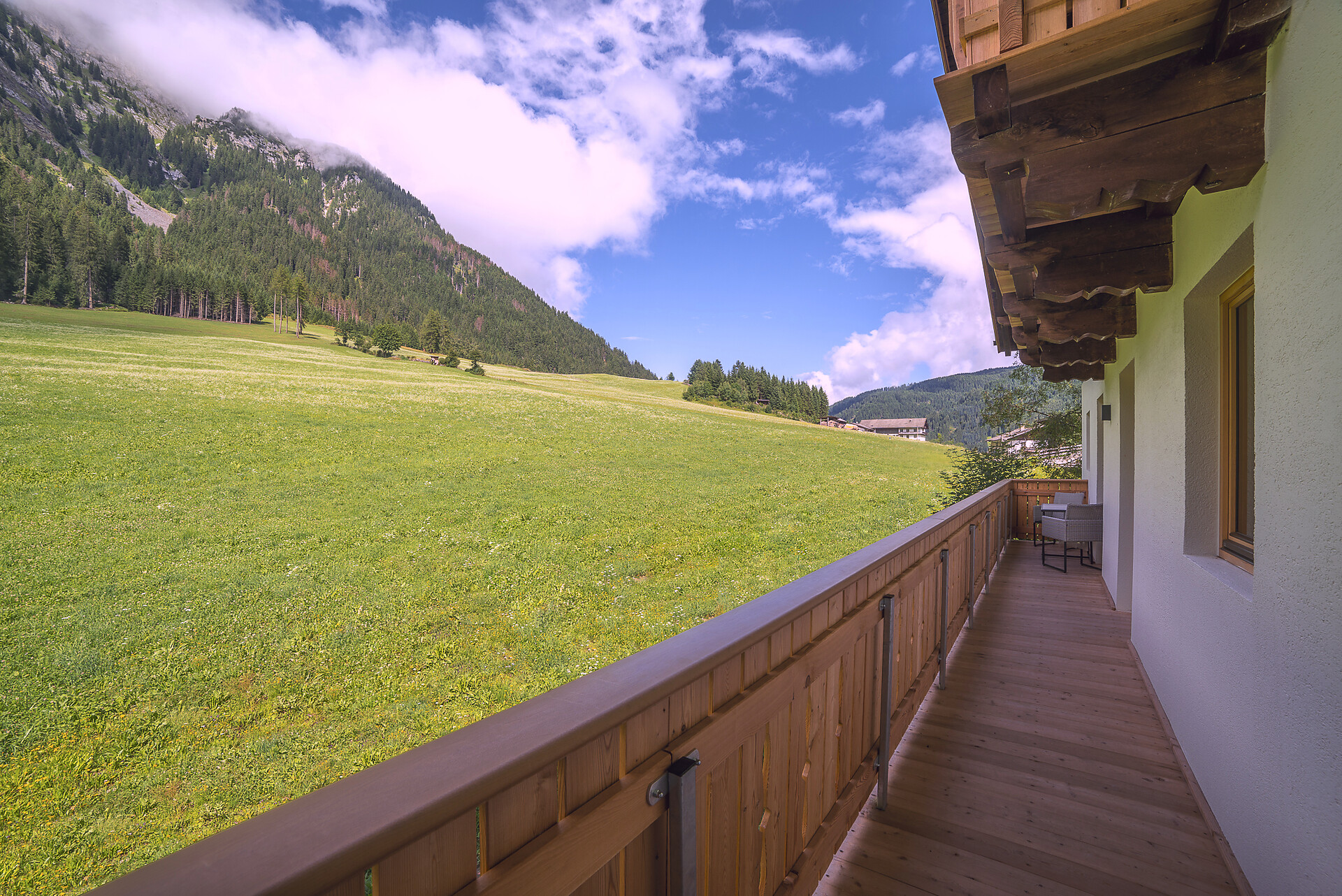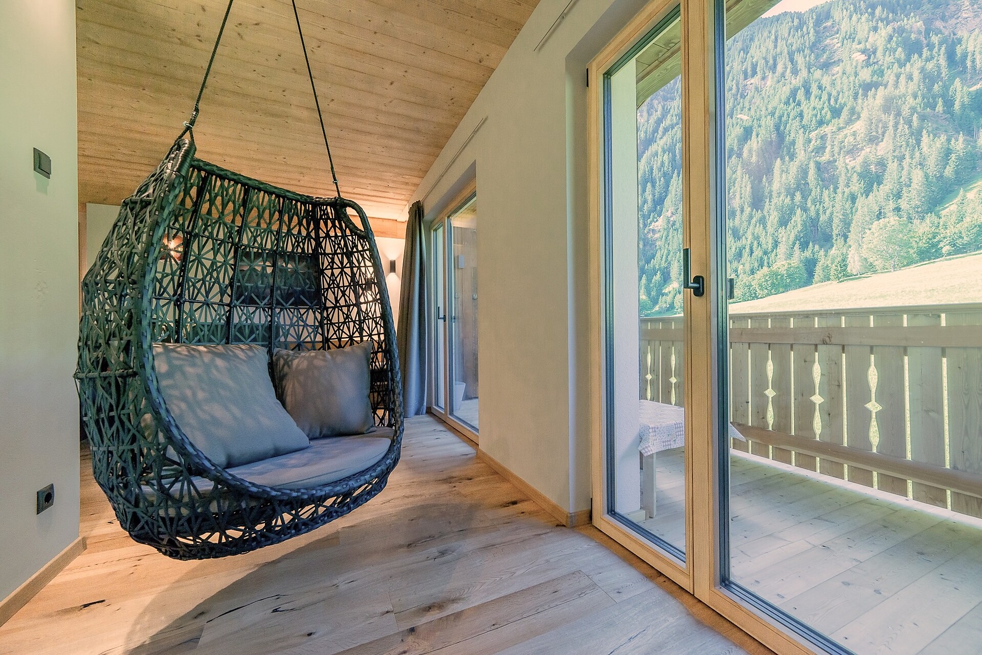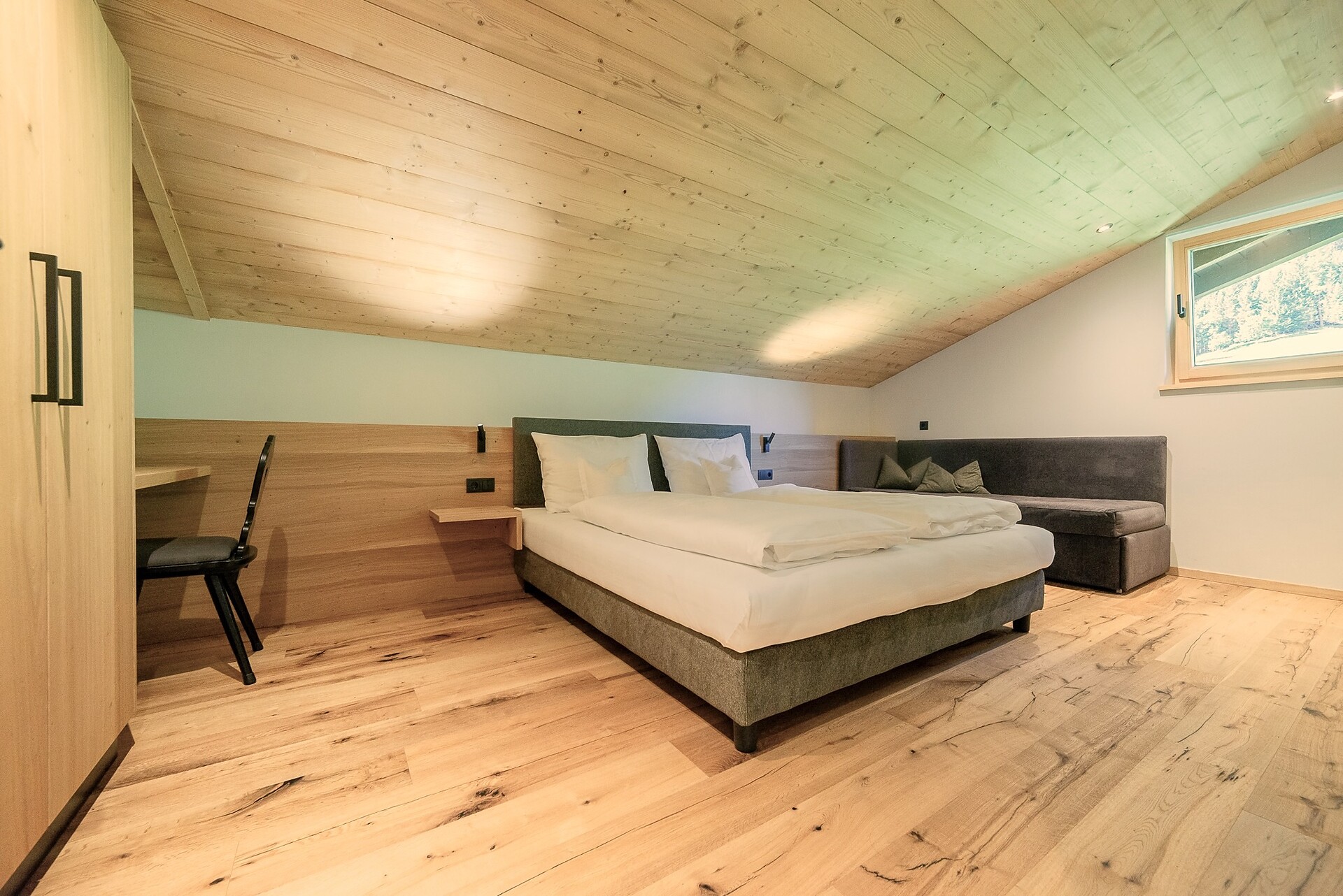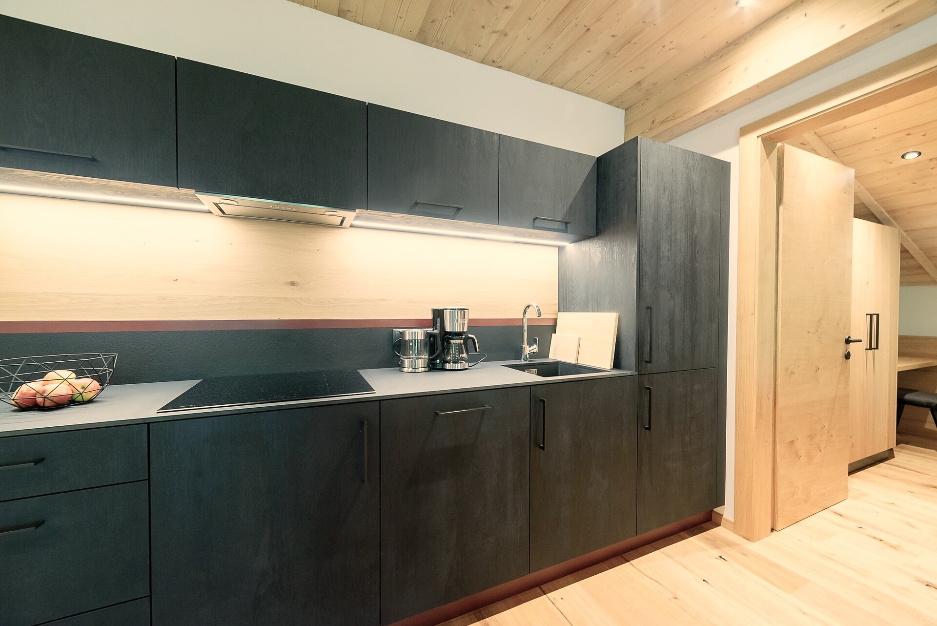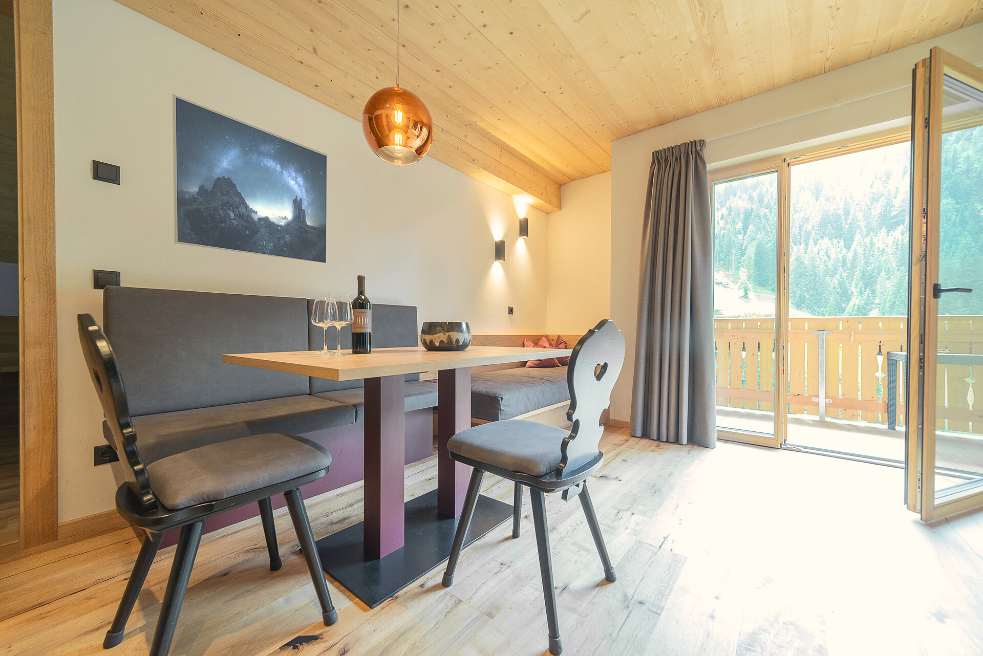 Vi aspetta un nuovissimo appartamento completamente attrezzato con cucina-soggiorno (piano cottura a induzione, frigorifero, lavastoviglie, macchina per il caffè, bollitore, stoviglie, utensili da cucina), zona salotto, Smart TV 42'', una camera da letto con letto king-size, un divano letto nel soggiorno e un ampio balcone in legno naturale con vista sulle montagne e il comprensorio sciistico di Racines-Giovo. Il pavimento, realizzato in legno massiccio di quercia, è riscaldato e offre una piacevole esperienza abitativa. Il bagno raffinato, con piastrelle scure e una doccia a pioggia, attira l'attenzione.