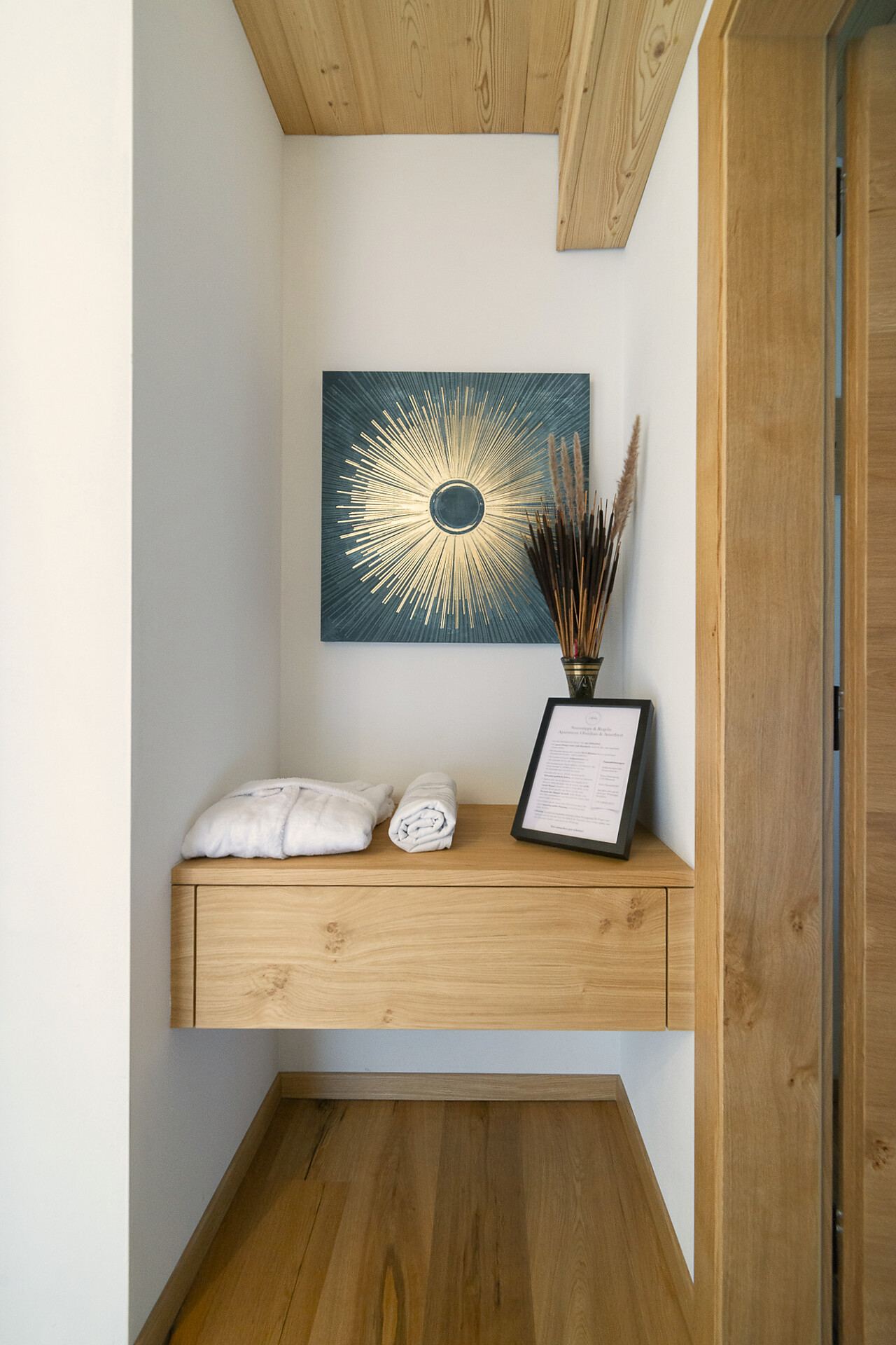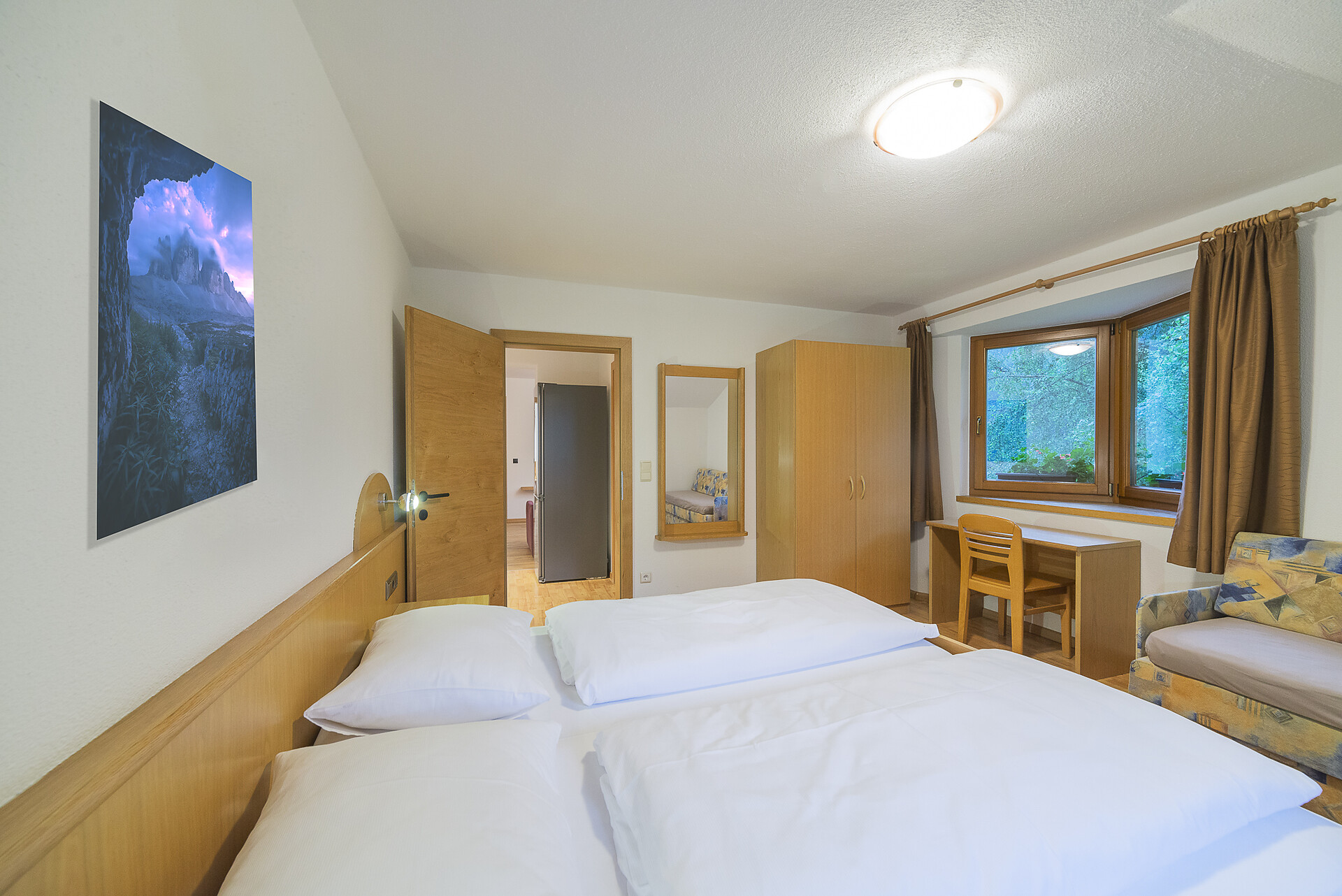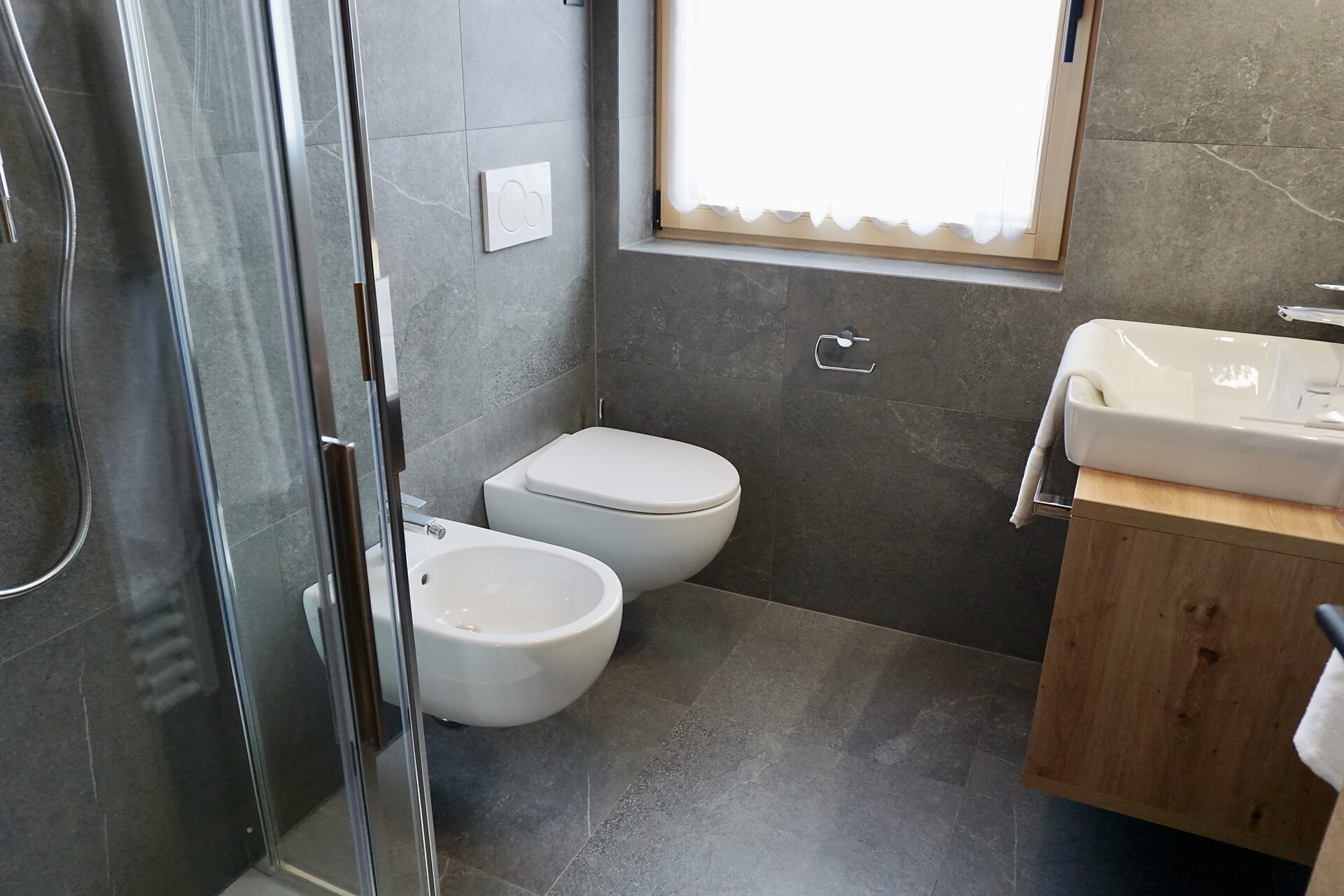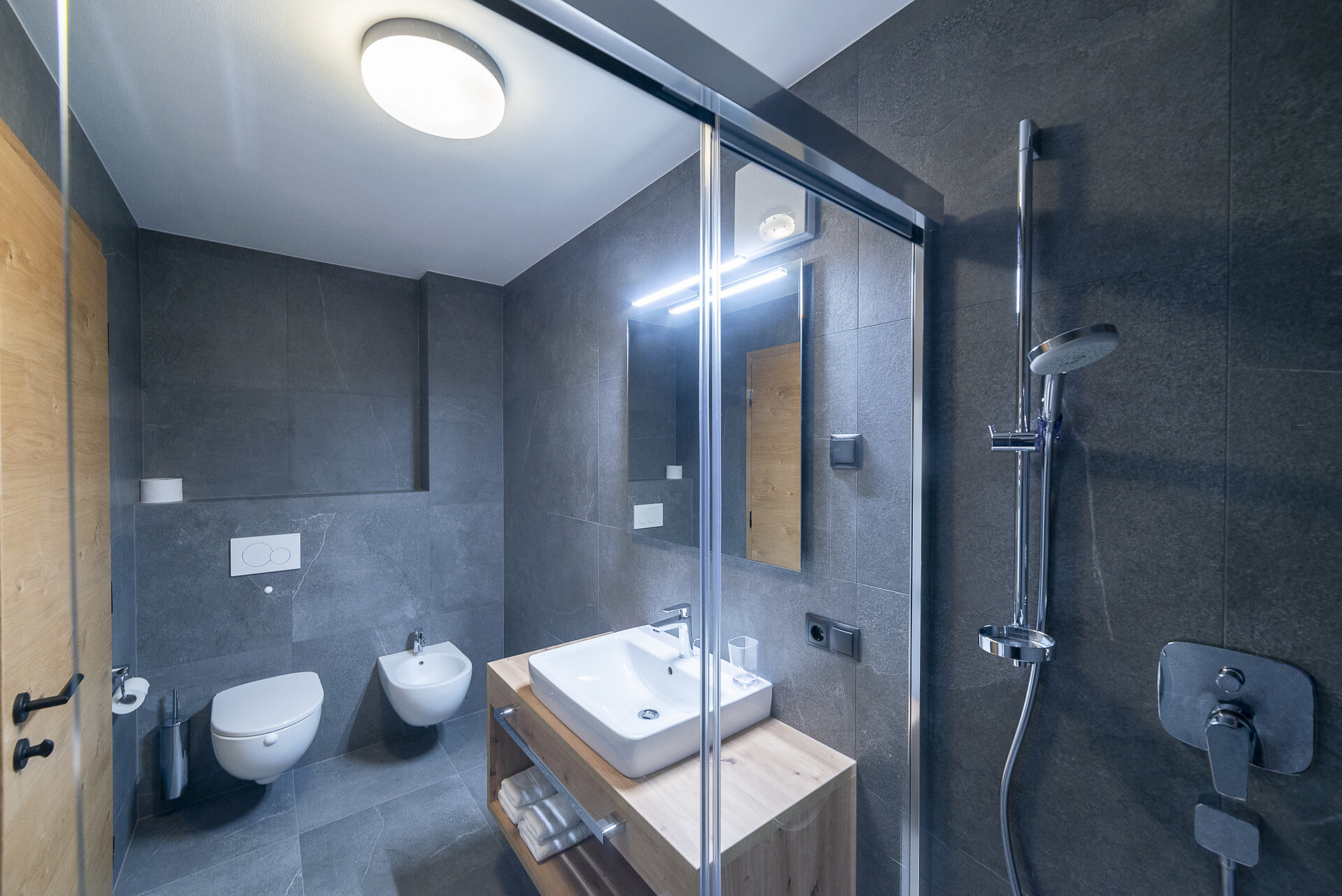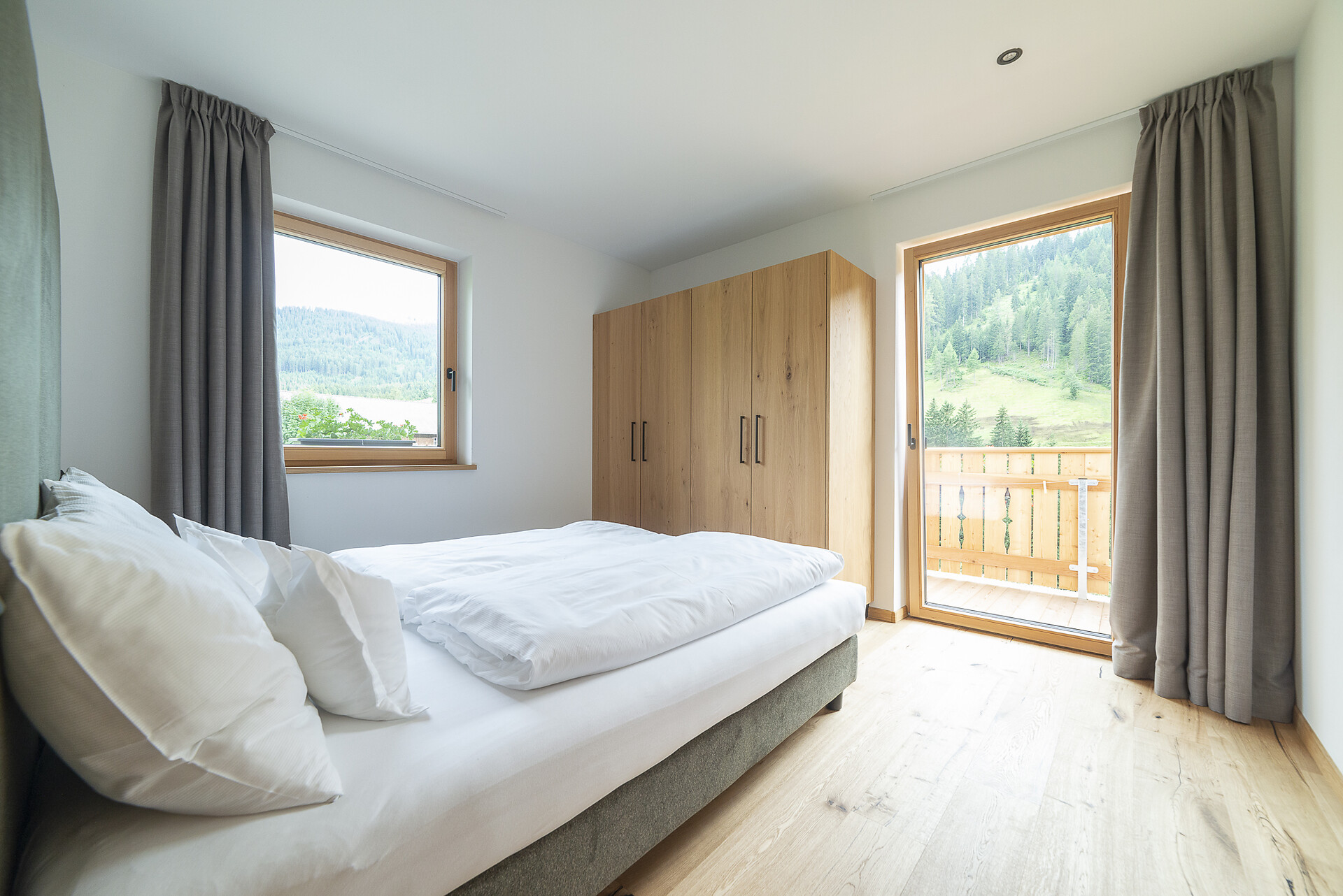 Vi aspetta un nuovissimo appartamento completamente attrezzato con cucina-soggiorno (piano cottura a induzione, frigorifero, lavastoviglie, macchina per il caffè, bollitore, stoviglie, utensili da cucina), zona salotto, Smart TV 42'', una camera da letto con letto king-size, un divano letto nel soggiorno e un ampio balcone in legno naturale con vista sulle montagne e il comprensorio sciistico di Racines-Giovo. Il pavimento, realizzato in legno massiccio di quercia, è riscaldato e offre una piacevole esperienza abitativa. Il bagno raffinato, con piastrelle scure e una doccia a pioggia, attira l'attenzione.