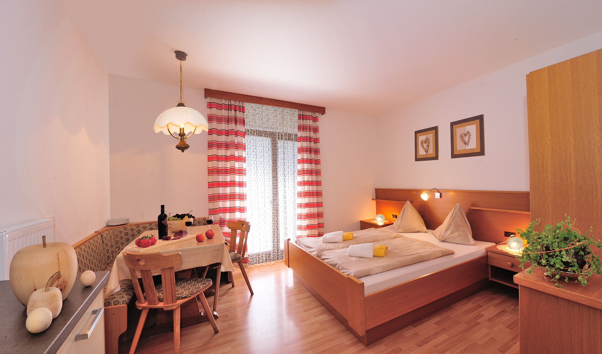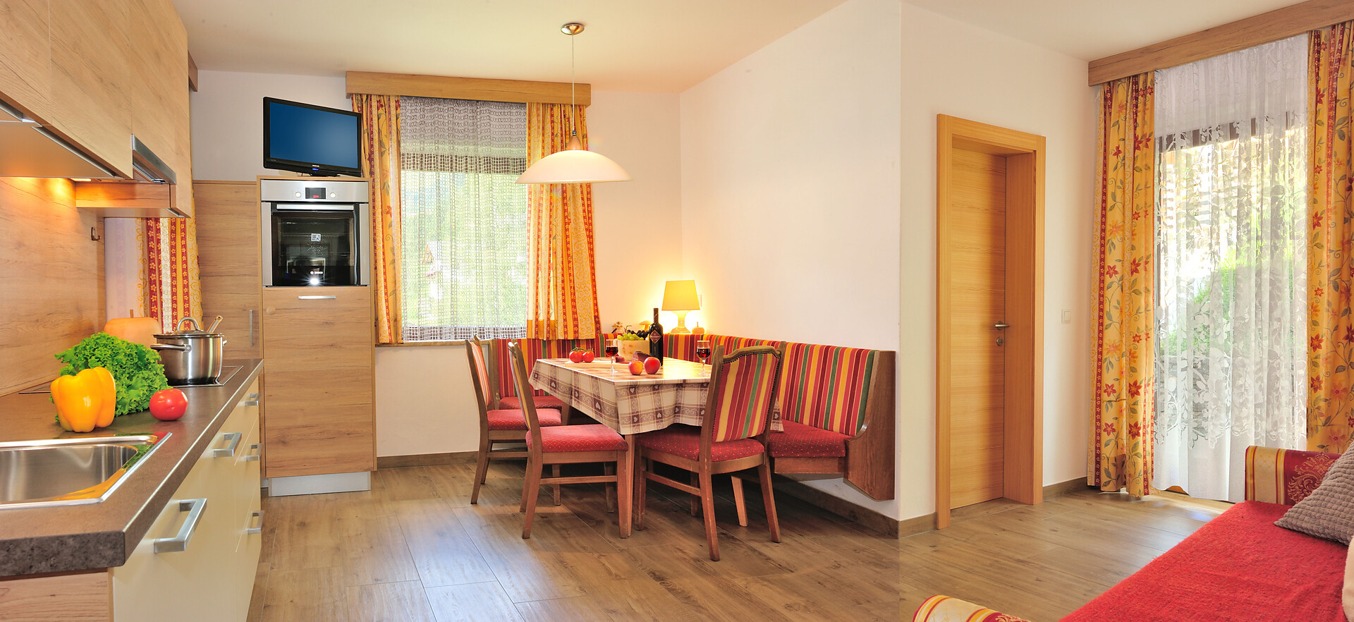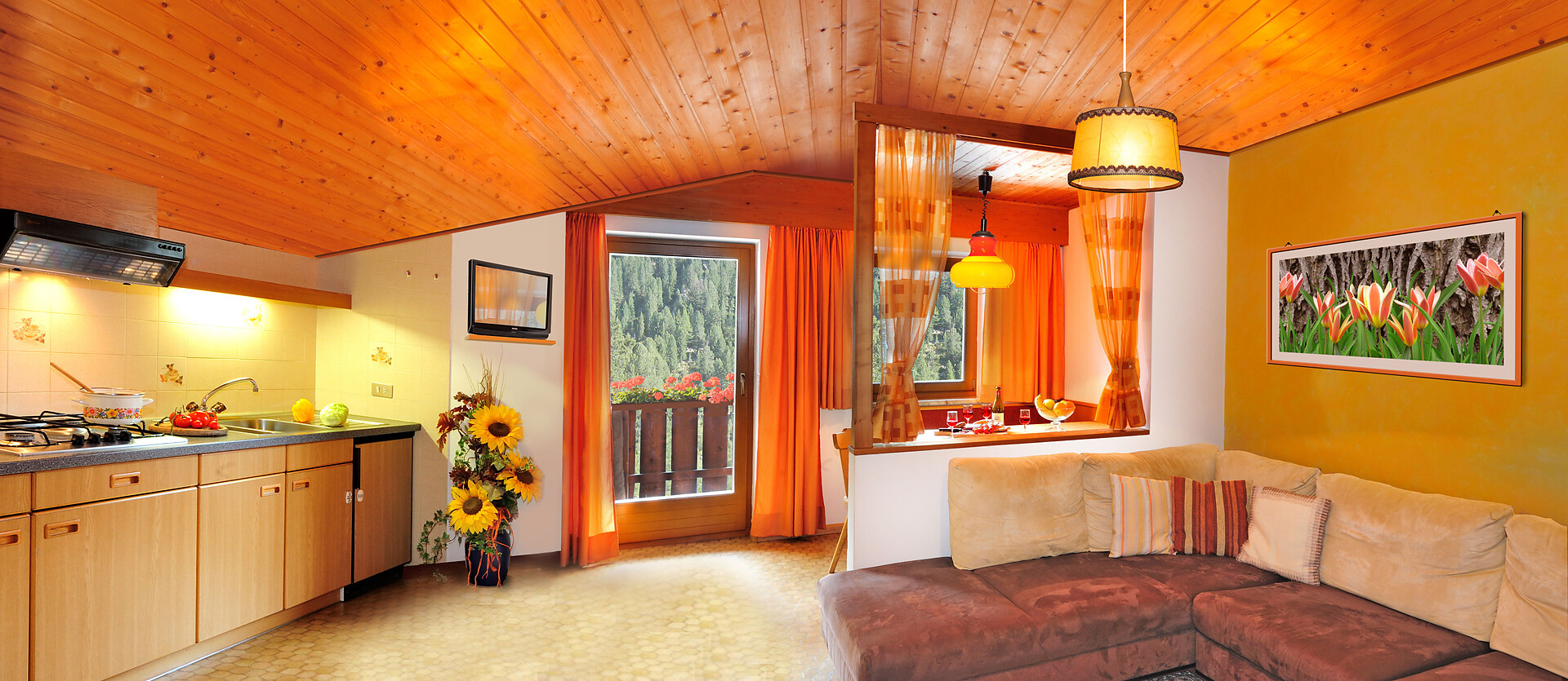 bello appartamento nel primo piano con 45m2: cucina/salotto complettamente attrezzata con divano (possibilità per dormire per 2 persone), camera da letto con letto matrimoniale e divano (possibilita per dormire per 4 persone), 2 bagni con doccia, WC e bidet, terrazza, balcone, Sat-TV, WLAN, accesso diretto all`esterno.