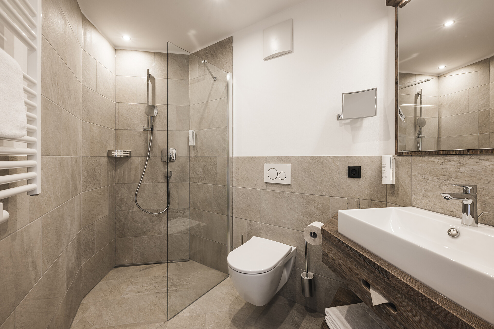 Bagno moderno con doccia, WC, scaldasalviette, asciugacapelli e specchio cosmetico.